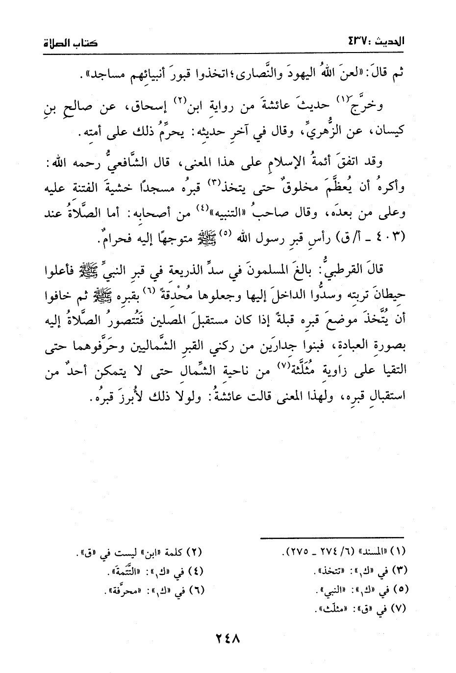 وقال صاحب ((التنبيه)) من أصحابه: أما الصلاة عند رأس قبر رسول الله - صَلَّى اللهُ عَلَيْهِ وَسَلَّمَ - متوجها إليه فحرام.
