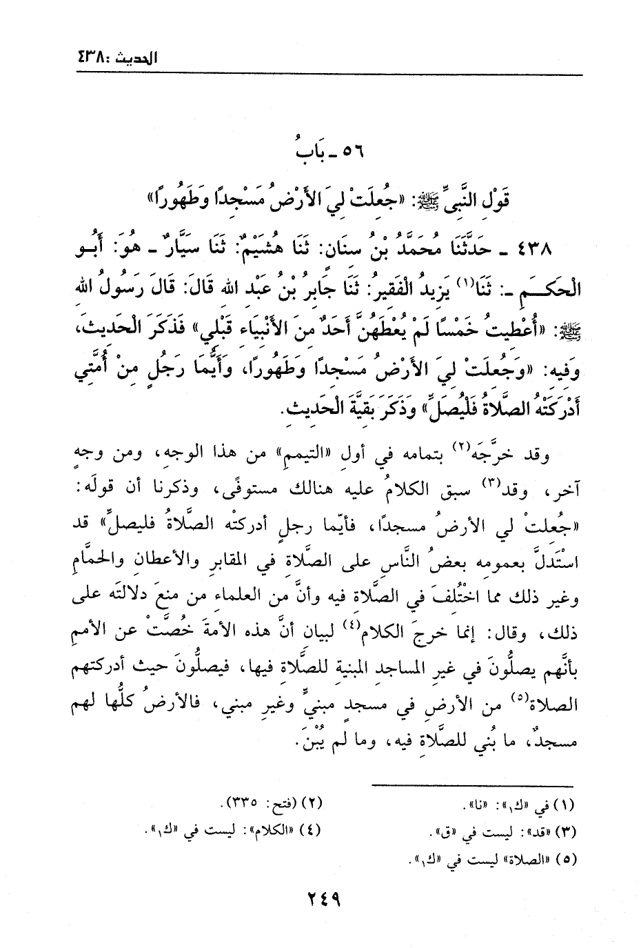 438 - حدثنا محمد بن سنان: ثنا هشيم: ثنا سيار - وهو أبو الحكم -: ثنا يزيد الفقير: ثنا جابر بن عبد الله، قال: قال رسول الله - صَلَّى اللهُ عَلَيْهِ وَسَلَّمَ -: ((أعطيت خمسا لم يعطهن أحد من الأنبياء قبلي)) .
