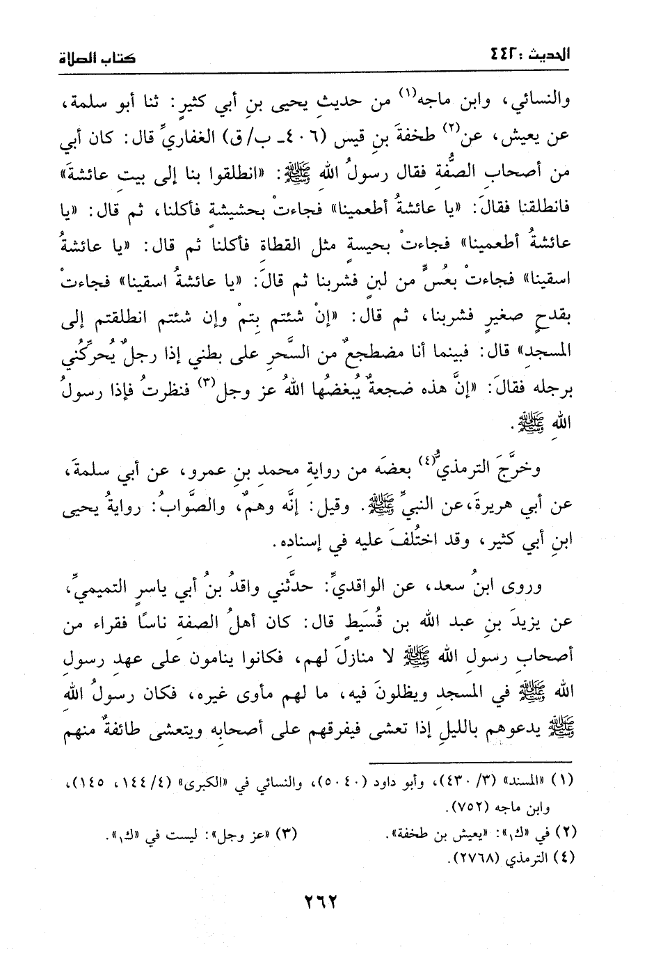 الغفاري، قال: كان أبي من أصحاب الصفة، فقال رسول الله - صَلَّى اللهُ عَلَيْهِ وَسَلَّمَ -: ((انطلقوا بنا إلى بيت عائشة)) ، فانطلقنا، فقال: ((يا عائشة، أطعمينا)) ، فجاءت بحشيشة فأكلنا، ثم قال: ((يا عائشة، أطعمينا)) ، فجاءت بحيسة مثل القطاة فأكلنا، ثم قال: ((يا عائشة، اسقينا)) ، فجاءت بعس من لبن، فشربنا، ثم قال: ((يا عائشة، اسقينا)) فجاءت بقدح صغير فشربنا، ثم قال: ((إن شئتم بتم، وإن شئتم انطلقتم إلى المسجد)) . قال: فبينما أنا مضطجع من السحر على بطني إذا رجل يحركني برجله، فقال: ((إن هذه ضجعة يبغضها الله - عز وجل -)) ، فنظرت فإذا رسول الله - صَلَّى اللهُ عَلَيْهِ وَسَلَّمَ -.