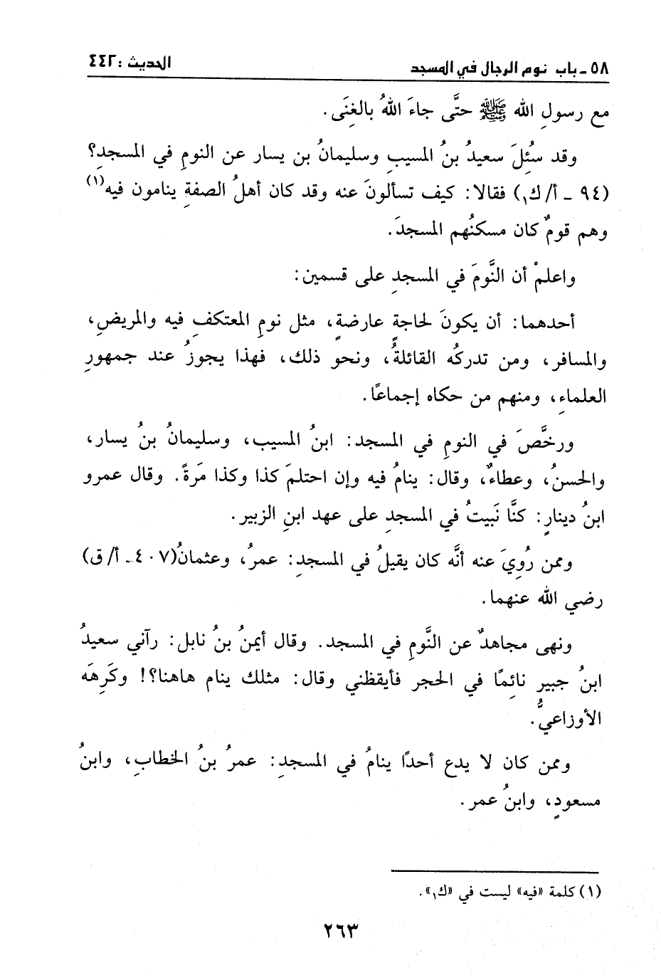 وقد سئل سعيد بن المسيب وسليمان بن يسار عن النوم في المسجد؟ فقالا: كيف تسألون عنه وقد كان أهل الصفة ينامون فيه، وهم قوم كان مسكنهم المسجد؟