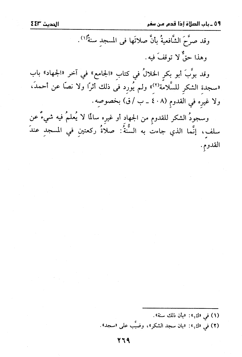 وقد بوب أبو بكر الخلال في ((كتاب الجامع)) في آخر الجهاد: ((باب سجدة الشكر للسلامة)) . ولم يورد في ذلك أثرا ولا نصا عن أحمد، ولا غيره في القدوم بخصوصه، وسجود الشكر للقدوم من الجهاد أو غيره سالما لا يعلم فيه شيء عن سلف، إنما الذي جاءت به السنة. صلاة ركعتين في المسجد عند القدوم.