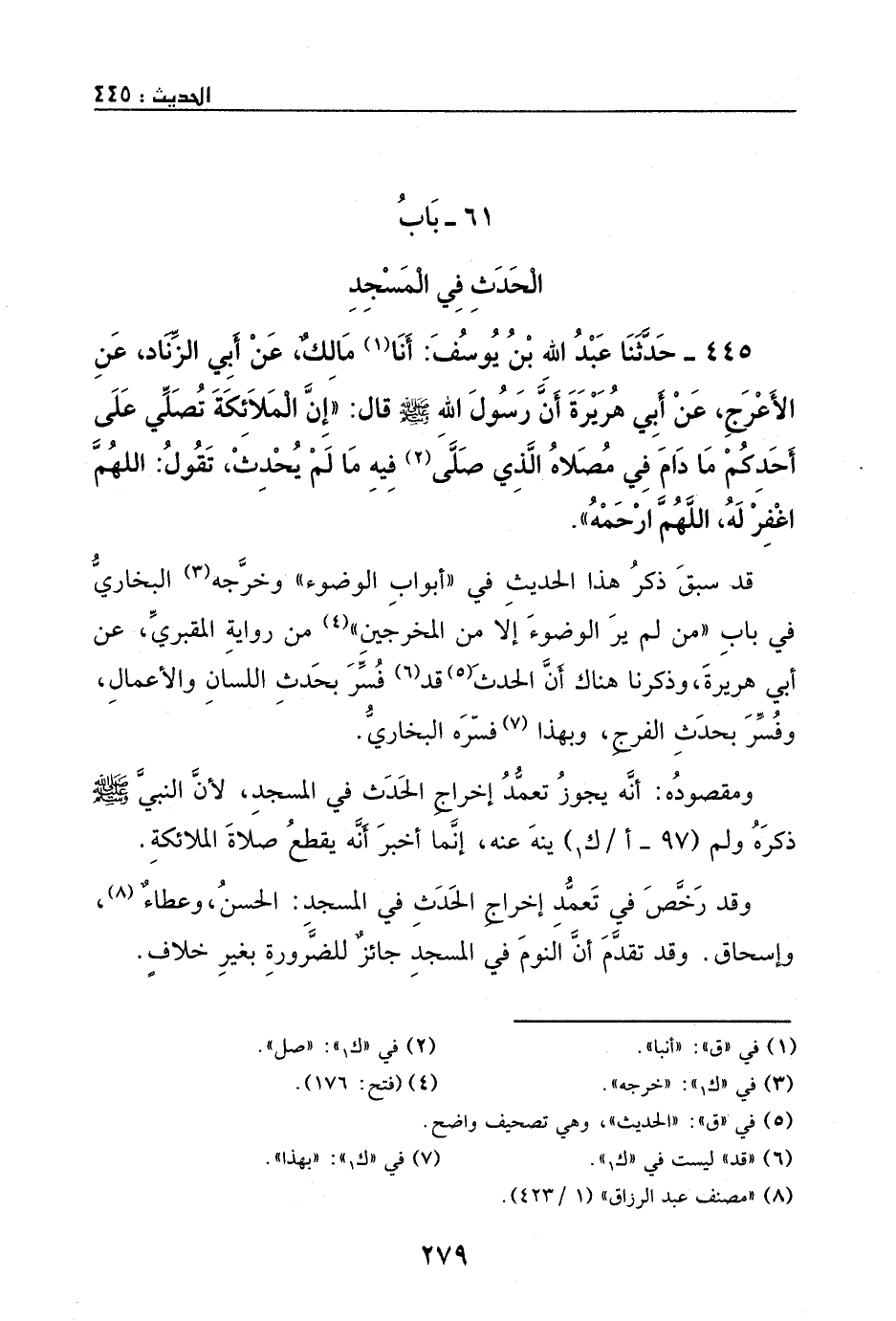 445 - حدثنا عبد الله بن يوسف: أبنا مالك، عن أبي الزناد، عن الأعرج، عن أبي هريرة، أن رسول الله - صَلَّى اللهُ عَلَيْهِ وَسَلَّمَ - قال: ((إن الملائكة تصلي على أحدكم ما دام في مصلاه الذي صلى فيه، ما لم يحدث، تقول: اللهم اغفر له، اللهم ارحمه)) .