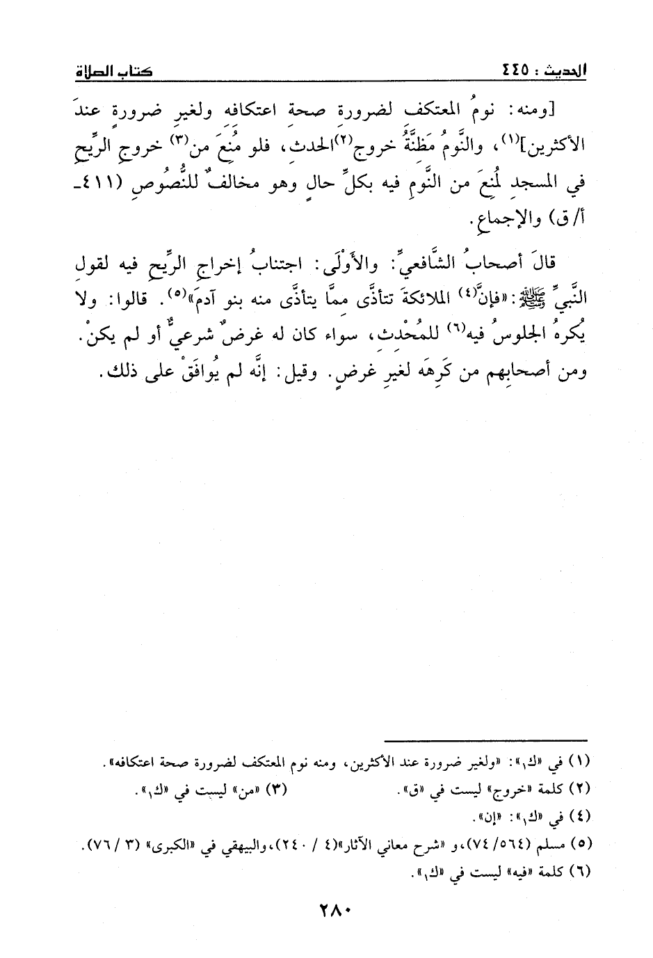 ومنه نوم المعتكف لضرورة صحة اعتكافه، ولغير ضرورة عند الأكثرين، والنوم مظنة خروج الحدث، فلو منع من خروج الريح في المسجد لمنع من النوم فيه بكل حال، وهو مخالف للنصوص والإجماع.
