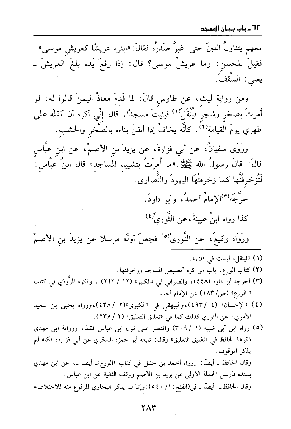 وروى سفيان، عن أبي فزارة، عن يزيد بن الأصم، عن ابن عباس، قال: قال رسول الله - صَلَّى اللهُ عَلَيْهِ وَسَلَّمَ -: ((ما أمرت بتشييد المساجد)) .