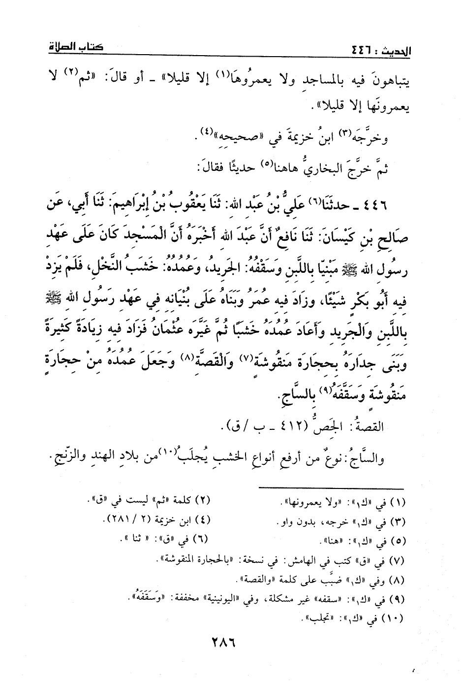 446 - ثنا علي بن عبد الله: ثنا يعقوب بن إبراهيم، ثنا أبي، عن صالح بن كيسان: ثنا نافع، أن عبد الله اخبره، أن المسجد كان على عهد رسول الله - صَلَّى اللهُ عَلَيْهِ وَسَلَّمَ - مبنيا باللبن، وسقفه الجريد، وعمده خشب النخل، فلم يزد فيه أبو بكر شيئا، وزاد فيه