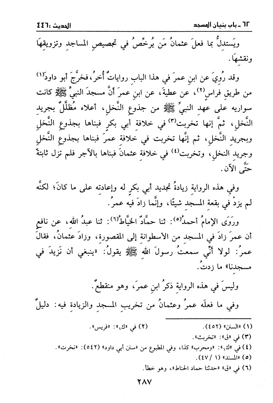فخرج أبو داود من طريق فراس، عن عطية، عن ابن عمر، أن مسجد النبي - صَلَّى اللهُ عَلَيْهِ وَسَلَّمَ - كانت سواريه على عهد النبي - صَلَّى اللهُ عَلَيْهِ وَسَلَّمَ - من جذوع النخل، أعلاه مظلل بجريد النخل، ثم إنها تخربت في خلافة أبي بكر، فبناها بجذوع النخل وجريد النخل، ثم إنها تخربت في خلافة عمر، فبناها بجذوع النخل وجريد النخل، وتخربت في خلافة عثمان فبناها بالآجر، فلم تزل ثابتة حتى الآن.