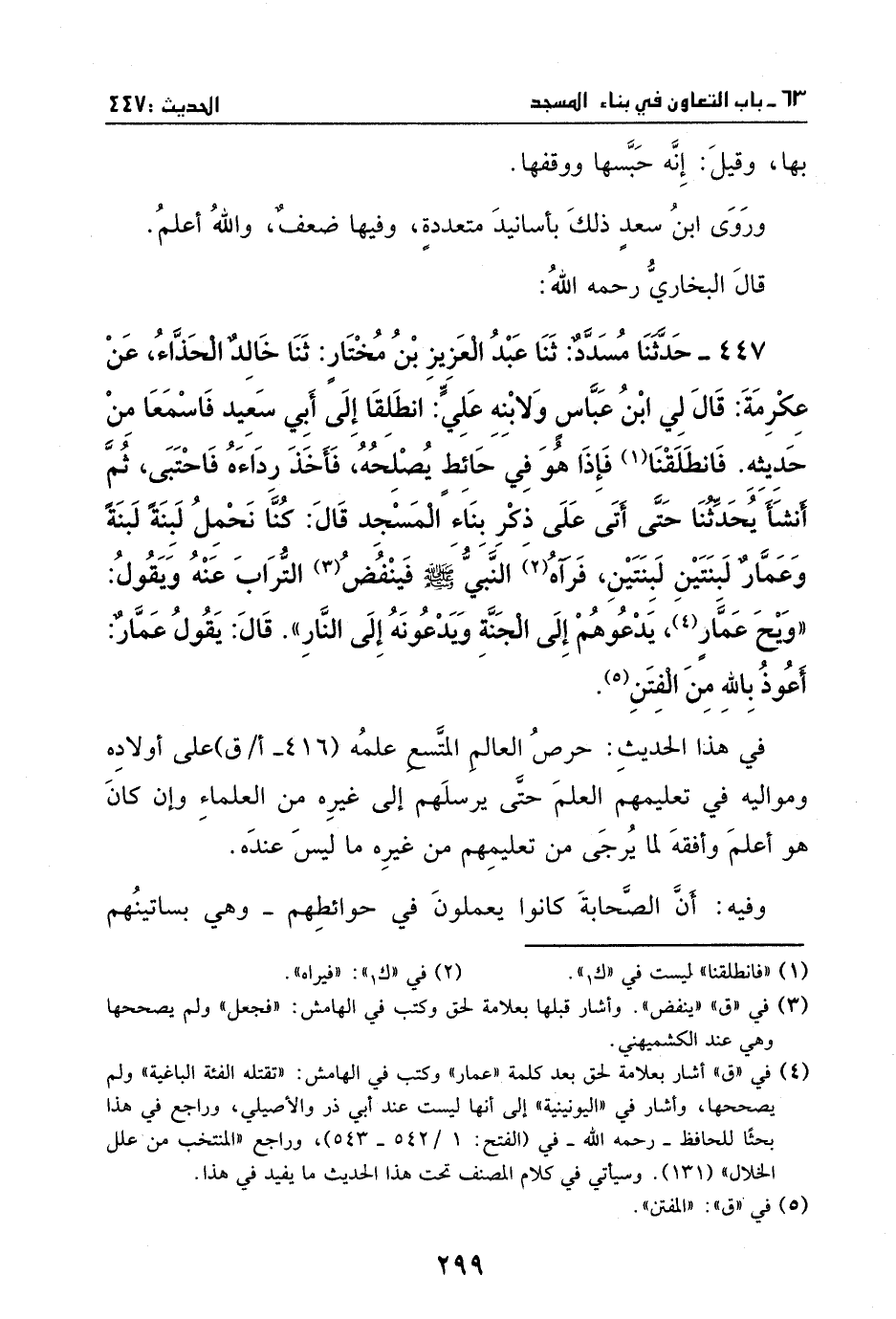 447 - حدثنا مسدد: ثنا عبد العزيز بن مختار: ثنا خالد الحذاء، عن عكرمة: قال لي ابن عباس ولابنه علي: إنطلقا إلى أبي سعيد، فاسمعا من حديثه، فإنطلقنا فإذا هو في حائط يصلحه، فأخذ رداءه فاحتبى، ثم أنشأ يحدثنا، حتى أتى على ذكر بناء