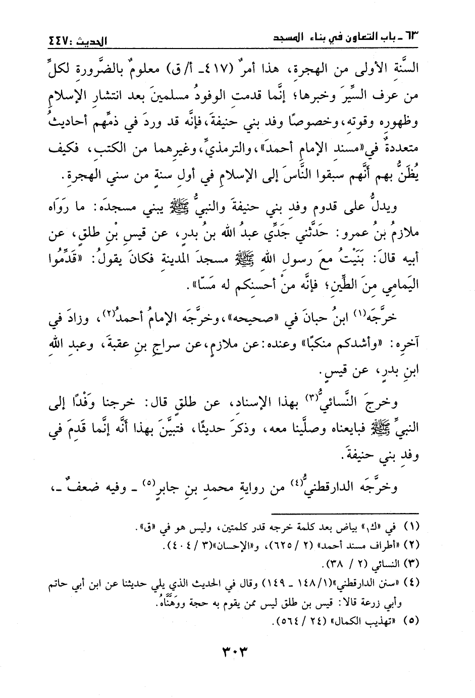 ويدل على قدوم وفد بني حنيفة والنبي - صَلَّى اللهُ عَلَيْهِ وَسَلَّمَ - يبني مسجده: ما رواه ملازم ابن عمرو: حدثني جدي عبد الله بن بدر، عن قيس بن طلق، عن أبيه، قال: بنيت مع رسول الله - صَلَّى اللهُ عَلَيْهِ وَسَلَّمَ - مسجد المدينة، فكان يقول: ((قدموا اليمامي من الطين؛ فإنه من أحسنكم لَهُ مسا)) .