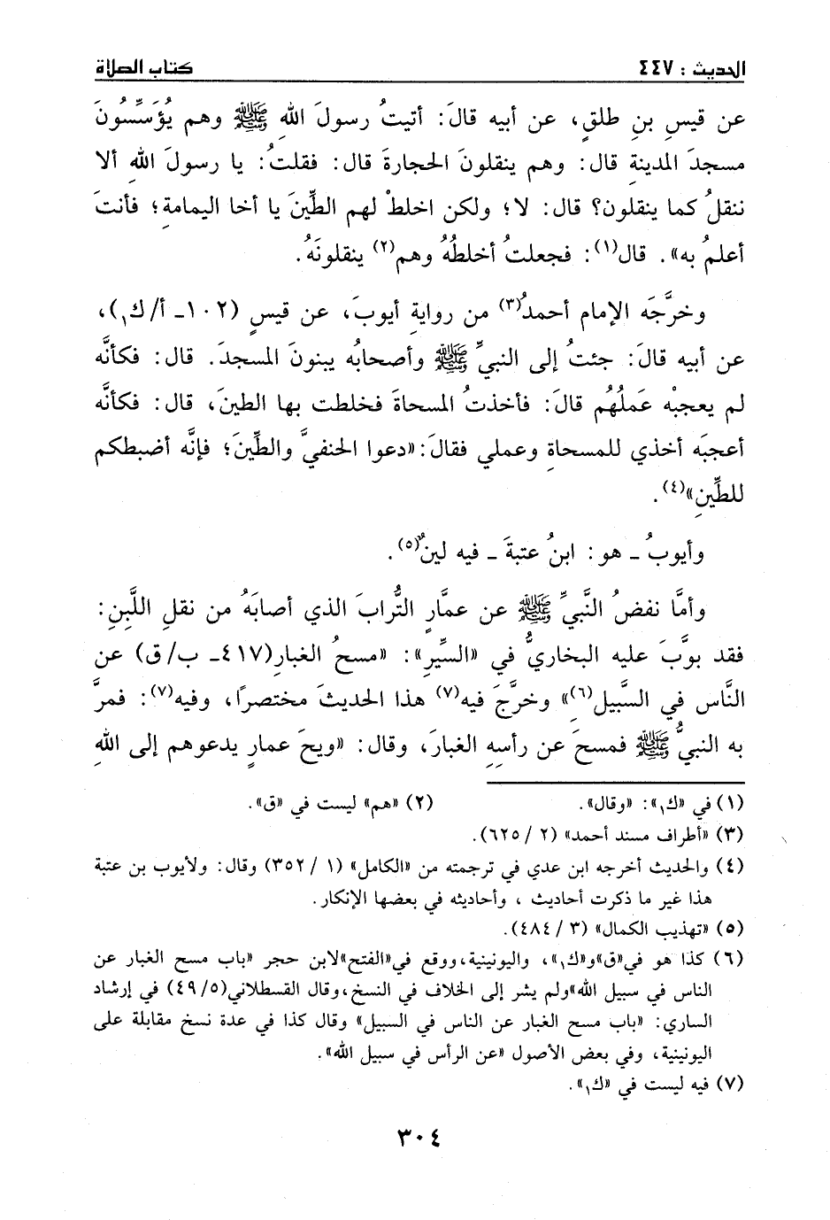 وخرجه الإمام أحمد من رواية أيوب، عن قيس، عن أبيه، قال: جئت إلى النبي - صَلَّى اللهُ عَلَيْهِ وَسَلَّمَ - وأصحابه يبنون المسجد. قال: فكأنه لم يعجبه عملهم. قال: فأخذت المسحاة، فخلطت بها الطين. قال: فكأنه أعجبه أخذي للمسحاة وعملي، فقال: ((دعوا الحنفي والطين؛ فإنه أضبطكم للطين)) .