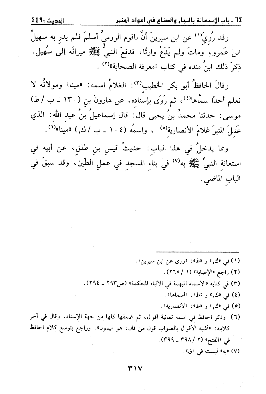 ثم رواه بإسناده، عن هارون بن موسى، ثنا محمد بن يحيى، قال: قال إسماعيل بن عبد الله: الذي عمل المنبر: غلام الأنصارية، واسمه: مينا.