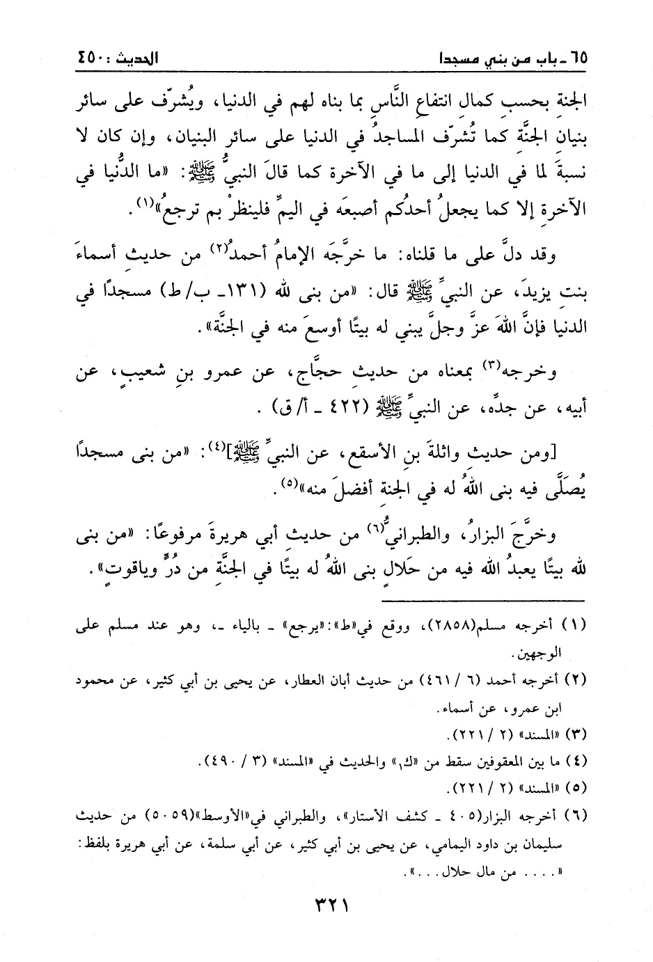 وقد دل على ما قلناه: ما خرجه الإمام أحمد من حديث أسماء بنت يزيد، عن النبي - صَلَّى اللهُ عَلَيْهِ وَسَلَّمَ -، قال: ((من بنى لله مسجدا في الدنيا فإن الله عز وجل يبني له بيتا أوسع منه في الجنة)) .