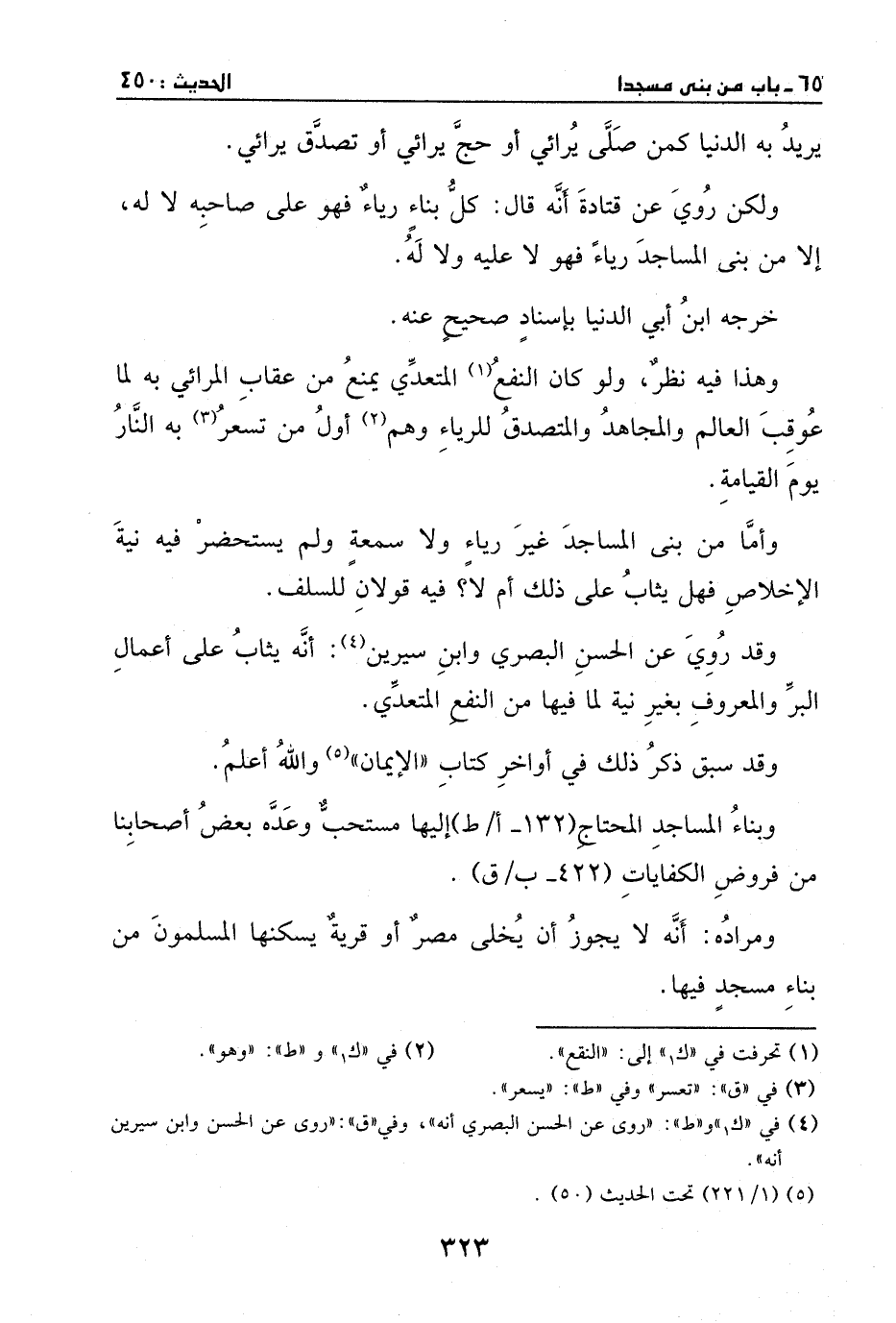 ولكن روى عن قتادة، أنه قال: كل بناء رياء فهو على صاحبه لا له، ألا من بنى المساجد رياء فهو لا عليه ولا له.
