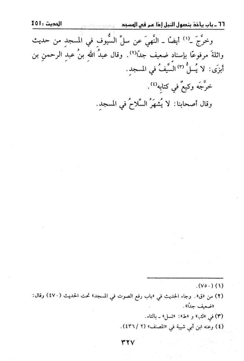 وخرج - أيضا -: النهي عن سهل السيوف في المسجد، من حديث واثلة - مرفوعا - بإسناد ضعيف جدا.
