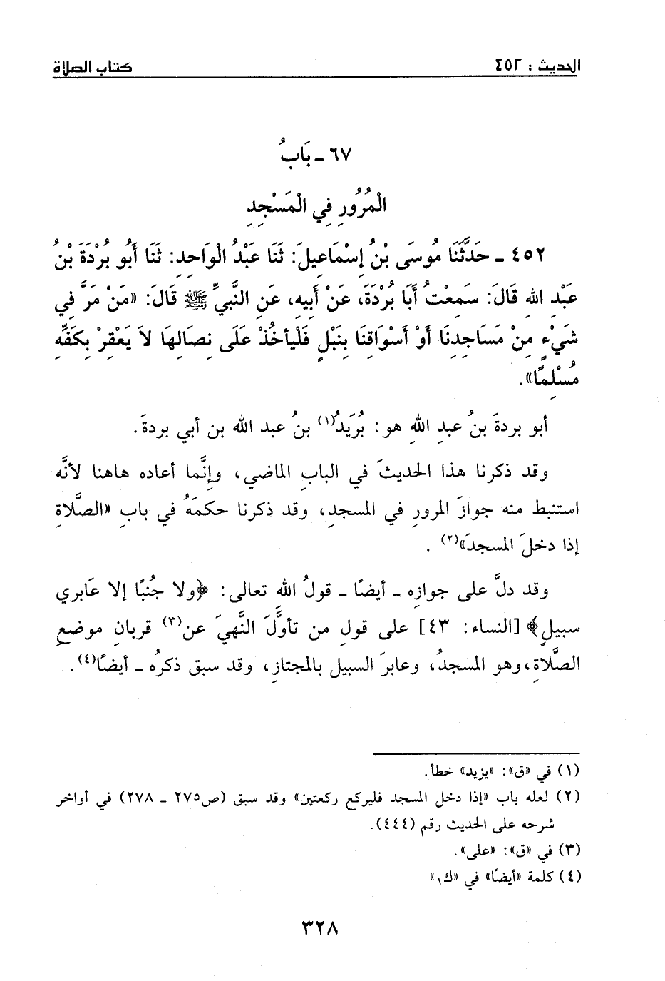 452 - حدثنا موسى بن إسماعيل: ثنا عبد الواحد: ثنا أبو بردة بن عبد الله، قال: سمعت أبا بردة، عن أبيه، عن النبي - صَلَّى اللهُ عَلَيْهِ وَسَلَّمَ - قال: ((من مر في شيء من مساجدنا أو أسواقنا بنبل فليأخذ على نصالها، لا يعقر بكفه مسلما)) .