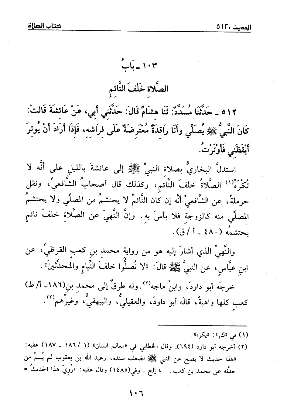 512 - حدثنا مسدد: ثنا يحيى: ثنا هشام: قال: حدثني أبي، عن عائشة، قالت: كان النبي - صَلَّى اللهُ عَلَيْهِ وَسَلَّمَ - يصلي، وأنا راقدة معترضة على فراشه، فإذا أراد أن يوتر أيقضني فأوترت.