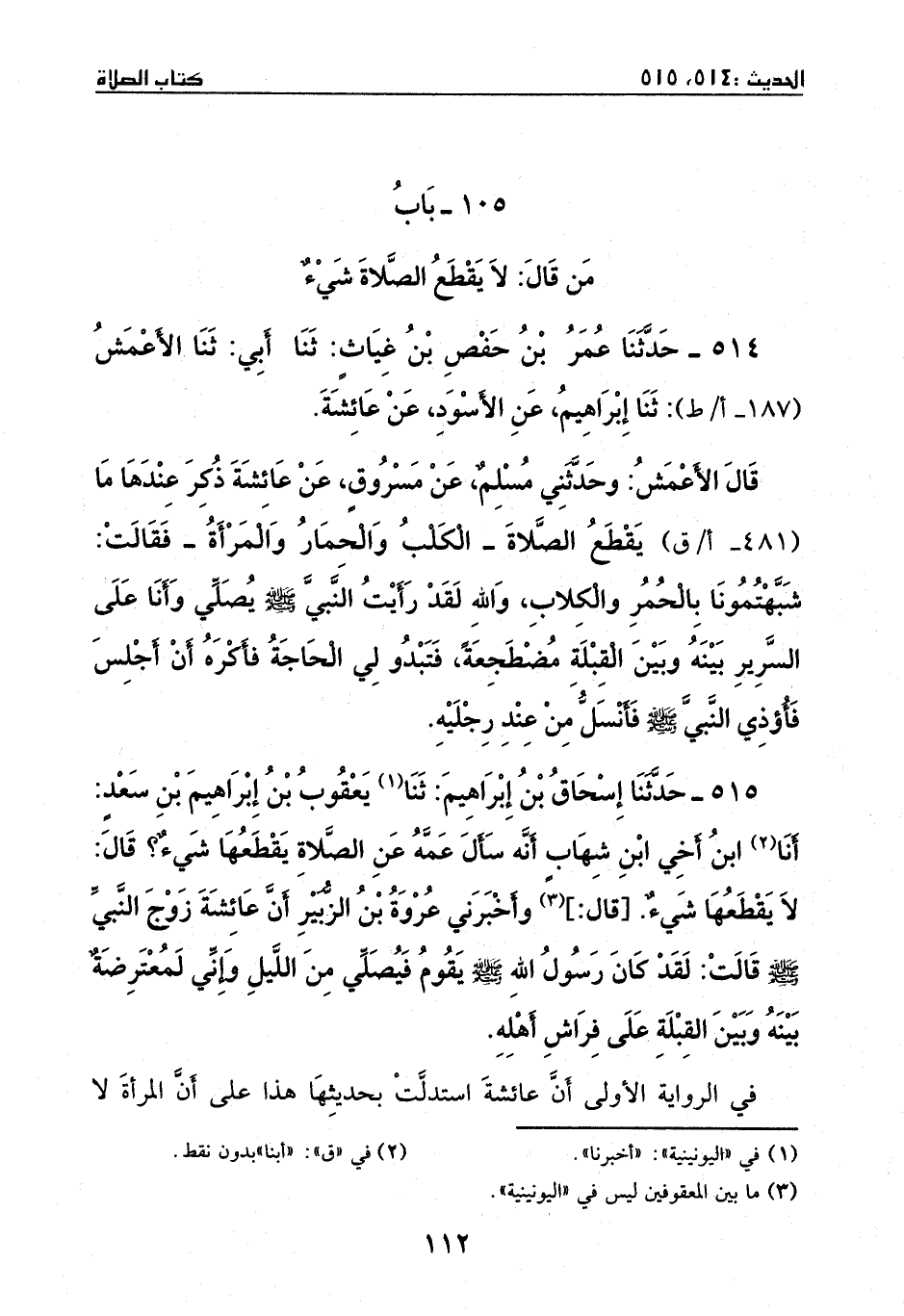 قال الأعمش: وحدثني مسلم، عن مسروق عن عائشة، ذكر عندها ما يقطع الصلاة: الكلب والحمار والمرأة، فقالت: شبهتمونا بالحمير والكلاب، والله لقد رأيت النبي - صَلَّى اللهُ عَلَيْهِ وَسَلَّمَ - يصلي وأنا على السرير، بينه وبين القبلة مضطجعة، فتبدو لي الحاجة، فأكره أن أجلس فأوذي النبي - صَلَّى اللهُ عَلَيْهِ وَسَلَّمَ -، فانسل من عند رجليه.