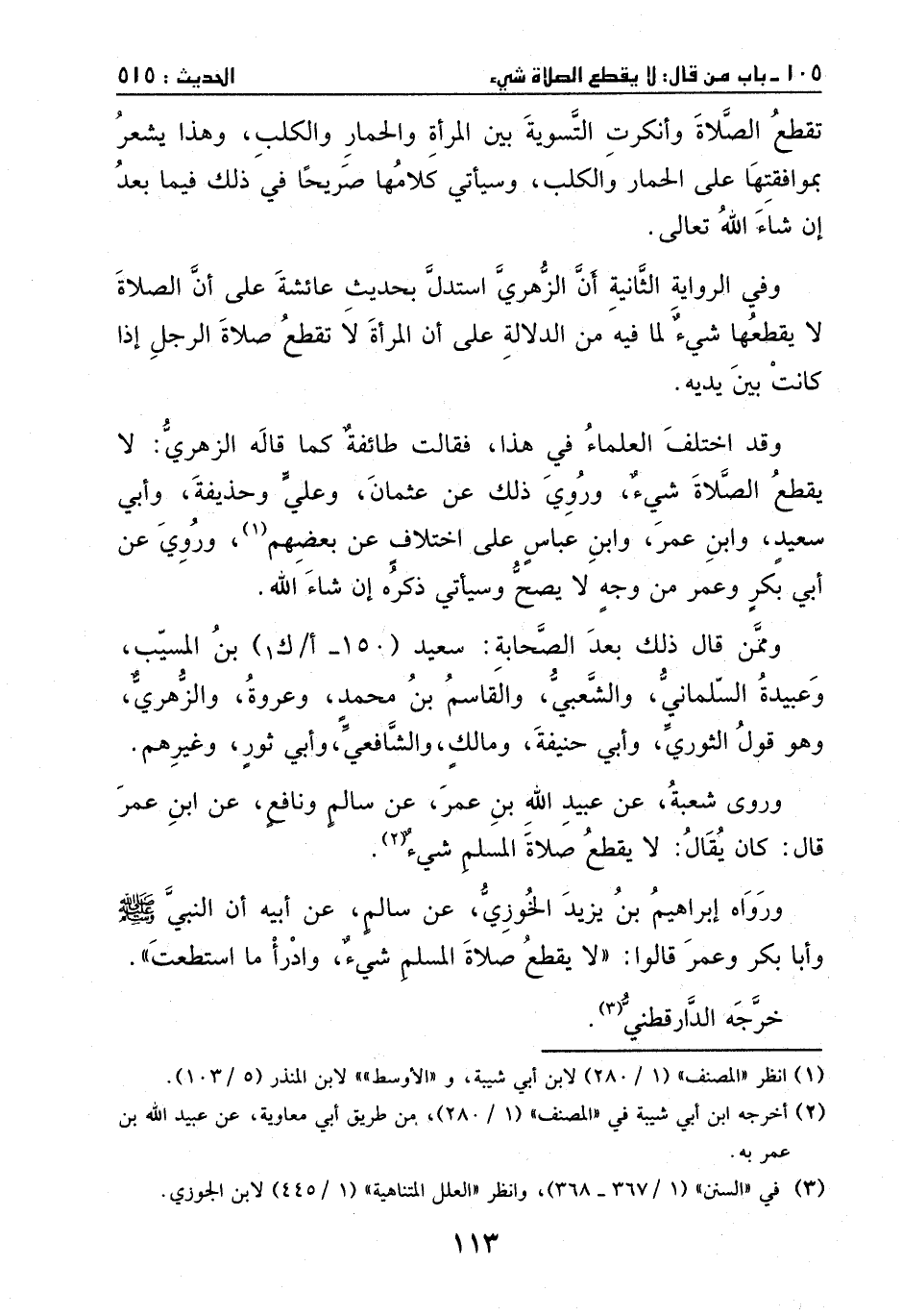 وروى شعبة، عن عبيد الله بن عمر، عن سالم ونافع، عن ابن عمر، قال: كان يقال: لا يقطع صلاة المسلم شئ.