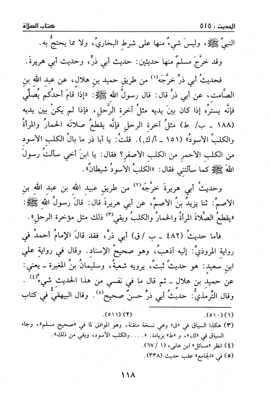 فحديث أبي ذر: خرجه من طريق حميد بن هلال، عن عبد الله بن الصامت، عن أبي ذر، قال: قال رسول الله - صَلَّى اللهُ عَلَيْهِ وَسَلَّمَ -: ((إذا قام أحدكم يصلي فإنه يستره إذا كان بين يديه مثل آخرة الرحل، فإذا لم يكن بين يديه مثل آخرة الرحل، فإنه يقطع صلاته الحمار والمرأة والكلب الأسود. قلت: يا أبا ذر، ما بال الكلب الأسود من الكلب الأحمر من الكلب الأصفر؟ فقال: يا ابن أخي، سألت رسول الله - صَلَّى اللهُ عَلَيْهِ وَسَلَّمَ - كما سألتني، فقال: ((الكلب الأسود شيطان)) .