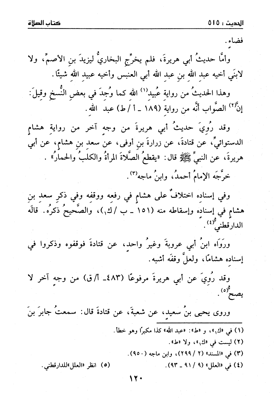وقد روى حديث أبي هريرة من وجه آخر: من رواية هشام الدستوائي، عن قتادة عن زرارة بن أوفى، عن سعد بن هشام، عن أبي هريرة، عن النبي - صَلَّى اللهُ عَلَيْهِ وَسَلَّمَ -، قال: