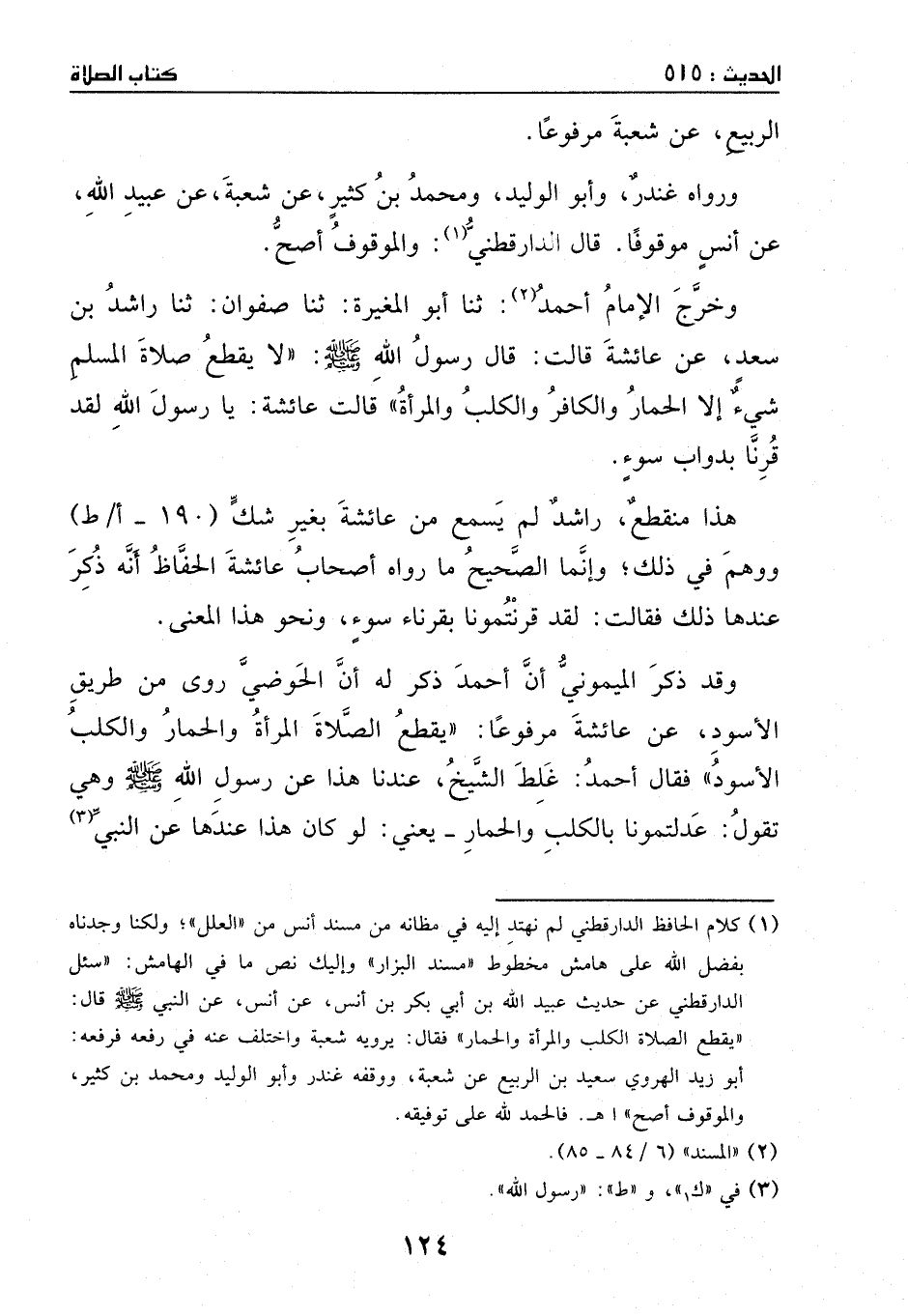 وقد ذكر الميموني أن أحمد ذكر له أن ألحوضي روى من طريق الأسود، عن عائشة - مرفوعا -: ((يقطع الصلاة المرأة والحمار والكلب الأسود)) . . فقال أحمد: غلط الشيخ عندنا؛ هذا عن رسول الله - صَلَّى اللهُ عَلَيْهِ وَسَلَّمَ - وهي تقول: عدلتمونا بالكلب والحمار؟ ! .