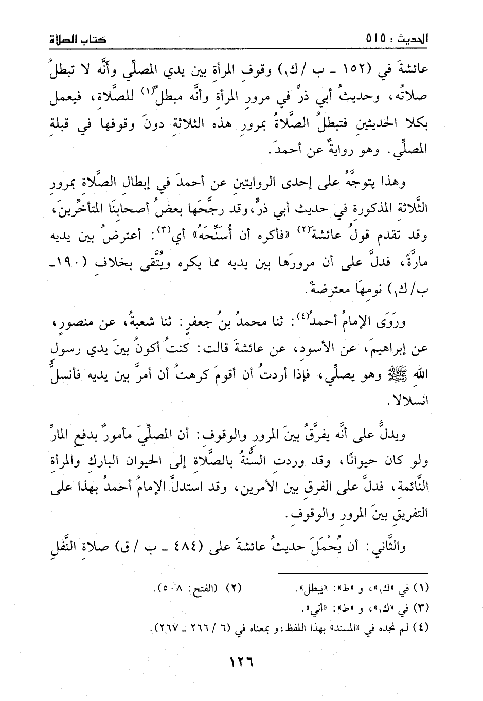 عائشة في وقوف المرأة بين يدي المصلي، وانه لا يبطل صلاته، وحديث أبي ذر في مرور المرأة، وأنه مبطل للصلاة، فيعمل بكلا الحديثين، فتبطل الصلاة بمرور هذه الثلاثة دون وقوفها في قبلة المصلي، وهو رواية عن أحمد.
