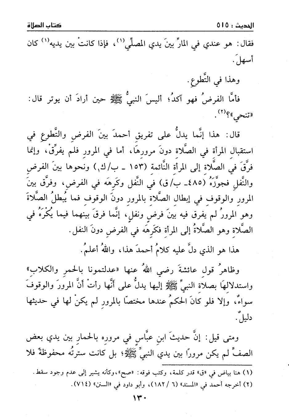 قال: هذا إنما يدل على تفريق أحمد بين الفرض والتطوع في استقبال المرأة في الصلاة دون مرورها، أما في المرور فلم يفرق، وإنما فرق في الصلاة إلى المرأة النائمة ونحوها بين الفرض والنفل، فجوزه في النفل وكرهه في الفرض، وفرق بين المرور والوقوف في إبطال الصلاة بالمرور دون الوقوف، فما يبطل الصلاة - وهو المرور - لم يفرق فيه بين فرض ونفل، إنما فرق بينهما فيما يكره في الصلاة، وهو الصلاة إلى المرأة، فكرهه في الفرض دون النفل، هذا هو الذي دل عليه كلام أحمد هذا. والله اعلم.