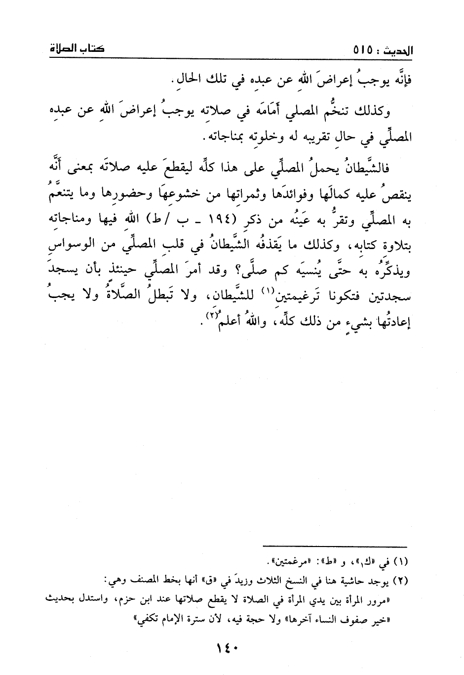 فالشيطان يحمل المصلي على هذا كله ليقطع عليه صلاته، بمعنى: أنه ينقص عليه كمالها وفوائدها وثمراتها من خشوعها وحضورها، وما يتنعم به المصلي وتقر به عينه من ذكر الله فيها، ومناجاته بتلاوة كتابه.