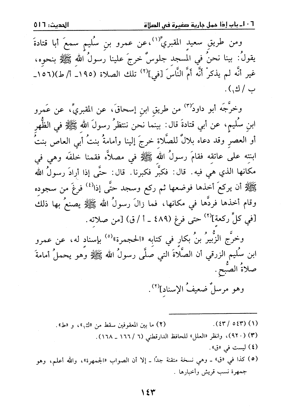 وخرجه أبو داود من طريق ابن إسحاق، عن المقبري، عن عمرو بن سليم، عن أبي قتادة، قال: بينما نحن ننتظر رسول الله - صَلَّى اللهُ عَلَيْهِ وَسَلَّمَ - في الظهر أو العصر، وقد دعاه بلال للصلاة، خرج إلينا وأمامة بنت أبي العاص بنت ابنته على عاتقه، فقام رسول الله - صَلَّى اللهُ عَلَيْهِ وَسَلَّمَ - في مصلاه، فقمنا خلفه، وهي في مكانها الذي هي فيه، قال: فكبر فكبرنا. قال: حتى إذا أراد رسول الله - صَلَّى اللهُ عَلَيْهِ وَسَلَّمَ - أن يركع أخذها فوضعها، ثم ركع وسجد حتى إذا فرغ من سجوده وقام أخذها فردها في مكانها، فما زال رسول الله - صَلَّى اللهُ عَلَيْهِ وَسَلَّمَ - يصنع بها ذلك في كل ركعة حتى فرغ من صلاته.