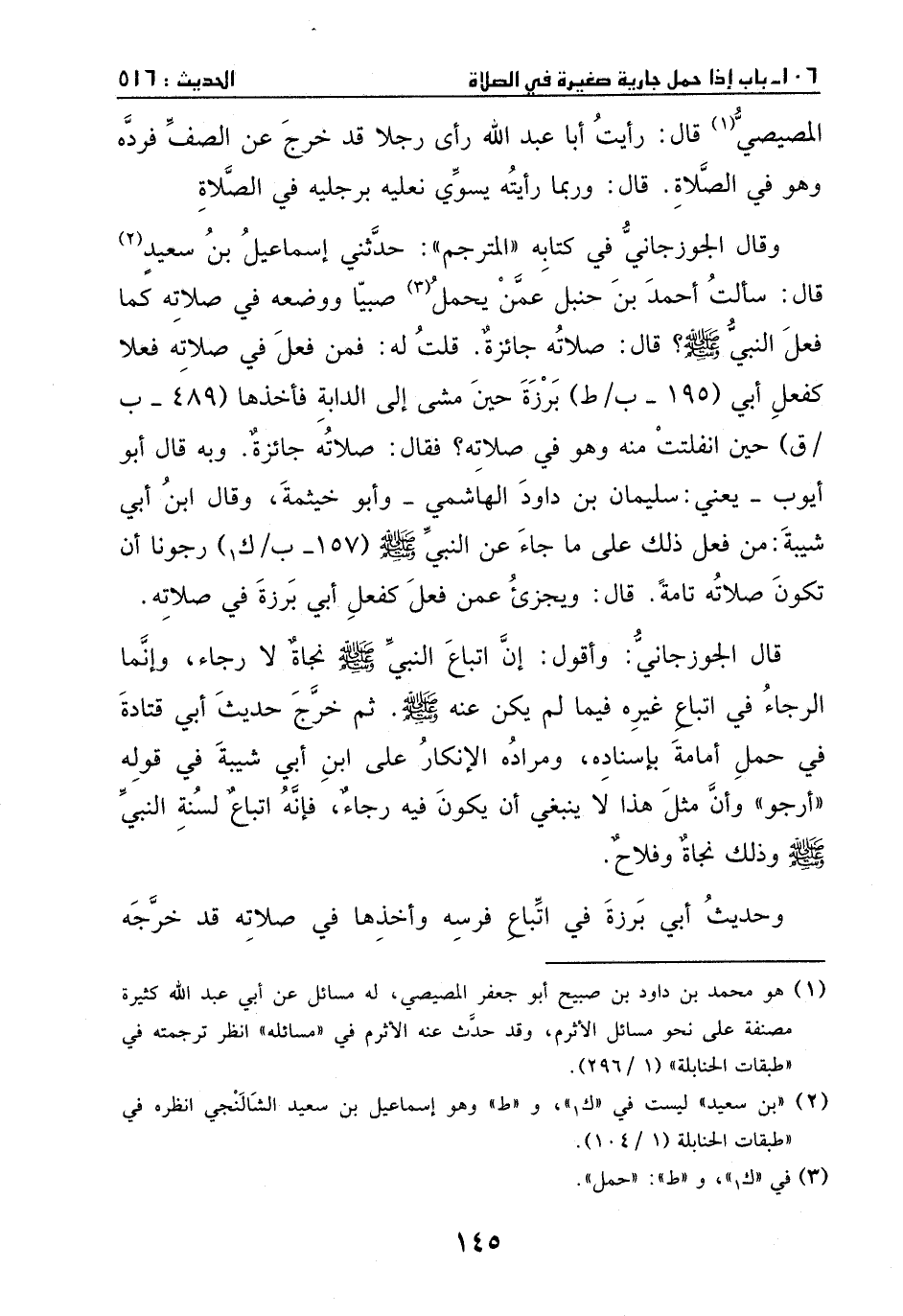 وقال الجوزجاني في كتابه ((المترجم)) : حدثني إسماعيل بن سعيد، قال: سألت أحمد بن حنبل عمن حمل صبيا ووضعه في صلاته، كما فعل النبي - صَلَّى اللهُ عَلَيْهِ وَسَلَّمَ -؟ قال: صلاته جائزة.