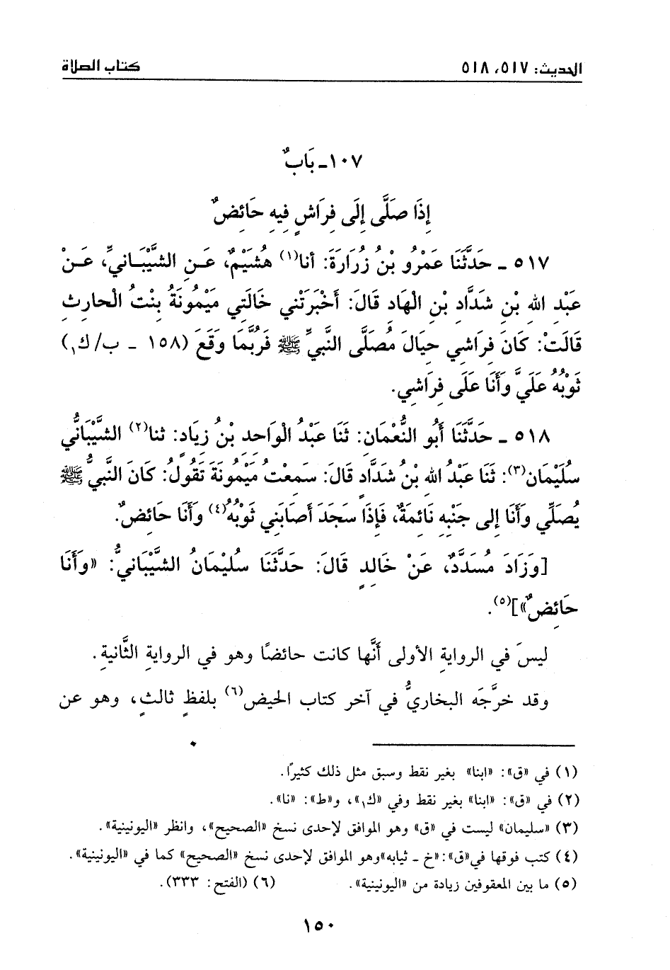 517 - حدثنا عمرو بن زرارة: أبنا هشيم، عن الشيباني: عن عبد الله بن شداد بن الهاد، قال: أخبرتني خالتي ميمونة بنت الحارث، قالت: كان فراشي حيال مصلى النبي - صَلَّى اللهُ عَلَيْهِ وَسَلَّمَ -، فربما وقع ثوبه علي وأنا على فراشي.