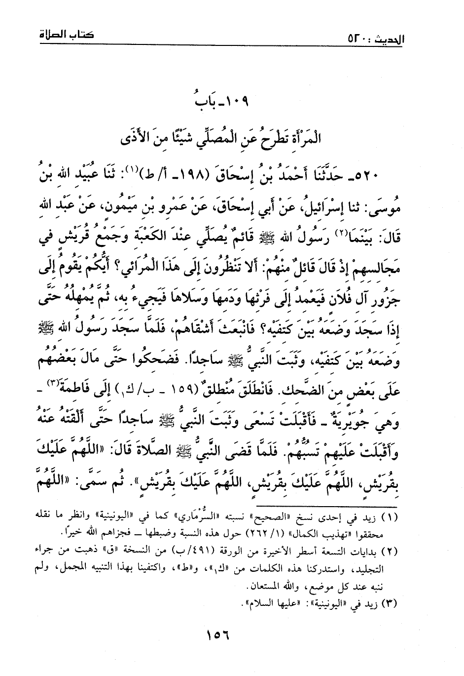 520 - حدثنا أحمد بن إسحاق: ثنا عبيد الله بن موسى: ثنا إسرائيل: عن أبي إسحاق، عن عمرو بن ميمون، عن عبد الله، قال: بينما رسول الله - صَلَّى اللهُ عَلَيْهِ وَسَلَّمَ - قائم يصلي عند الكعبة، وجمع قريش في مجالسهم، إذ قال قائل منهم: ألا تنظرون إلى هذا المرائي، أيكم يقوم إلى جزور آل فلان، فيعمد إلى فرثها ودمها وسلاها فيجيء به، ثم يمهله حتى إذا سجد وضعه بين كتفيه؟ فانبعث أشقاهم، فلما سجد رسول الله - صَلَّى اللهُ عَلَيْهِ وَسَلَّمَ - وضعه بين كتفيه، وثبت النبي - صَلَّى اللهُ عَلَيْهِ وَسَلَّمَ - ساجدا، فضحكوا حتى مال بعضهم على بعض من الضحك، فانطلق منطلق إلى فاطمة - وهي جويرية -، فأقبلت تسعى، وثبت النبي - صَلَّى اللهُ عَلَيْهِ وَسَلَّمَ - ساجدا حتى ألقته عنه، وأقبلت عليهم تسبهم، فلما قضى النبي - صَلَّى اللهُ عَلَيْهِ وَسَلَّمَ - الصلاة قال: ((اللهم عليك بقريش، اللهم عليك بقريش، اللهم عليك بقريش)) ، ثم سمى: ((اللهم
