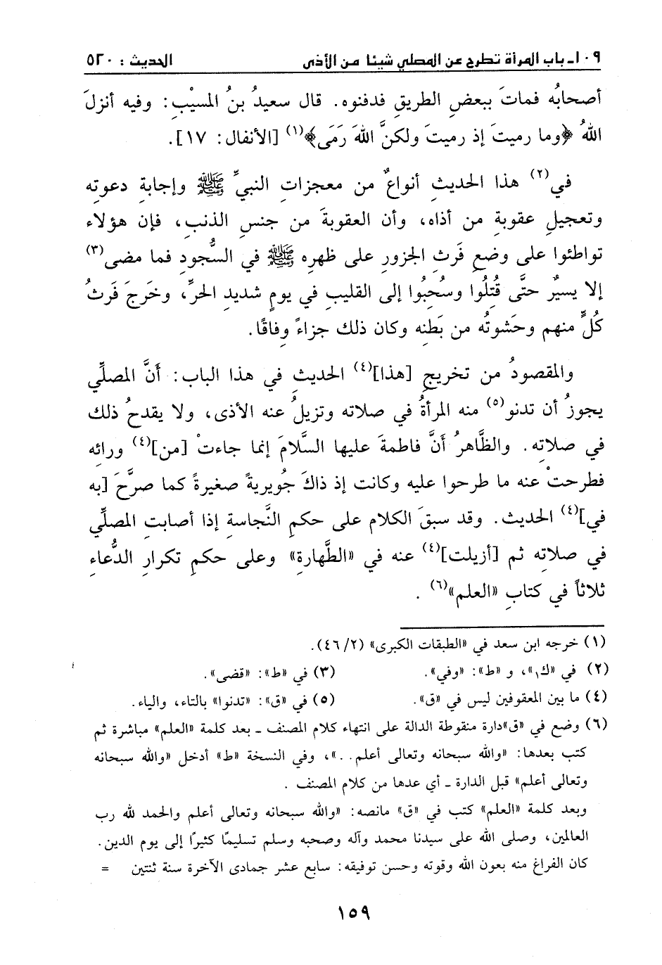 وفي هذا الحديث: أنواع من معجزات النبي - صَلَّى اللهُ عَلَيْهِ وَسَلَّمَ - وإجابة دعوته، وتعجيل عقوبة من أذاه، وأن العقوبة من جنس الذنب، بأن هؤلاء تواطؤا على وضع فرث الجزور على ظهره - صَلَّى اللهُ عَلَيْهِ وَسَلَّمَ - في السجود، فما مضى إلا يسير حتى قتلوا وسحبوا إلى القليب في يوم شديد الحر، وخرج فرث كل منهم وحشوته من بطنه، وكان ذلك جزاء وفاقا.