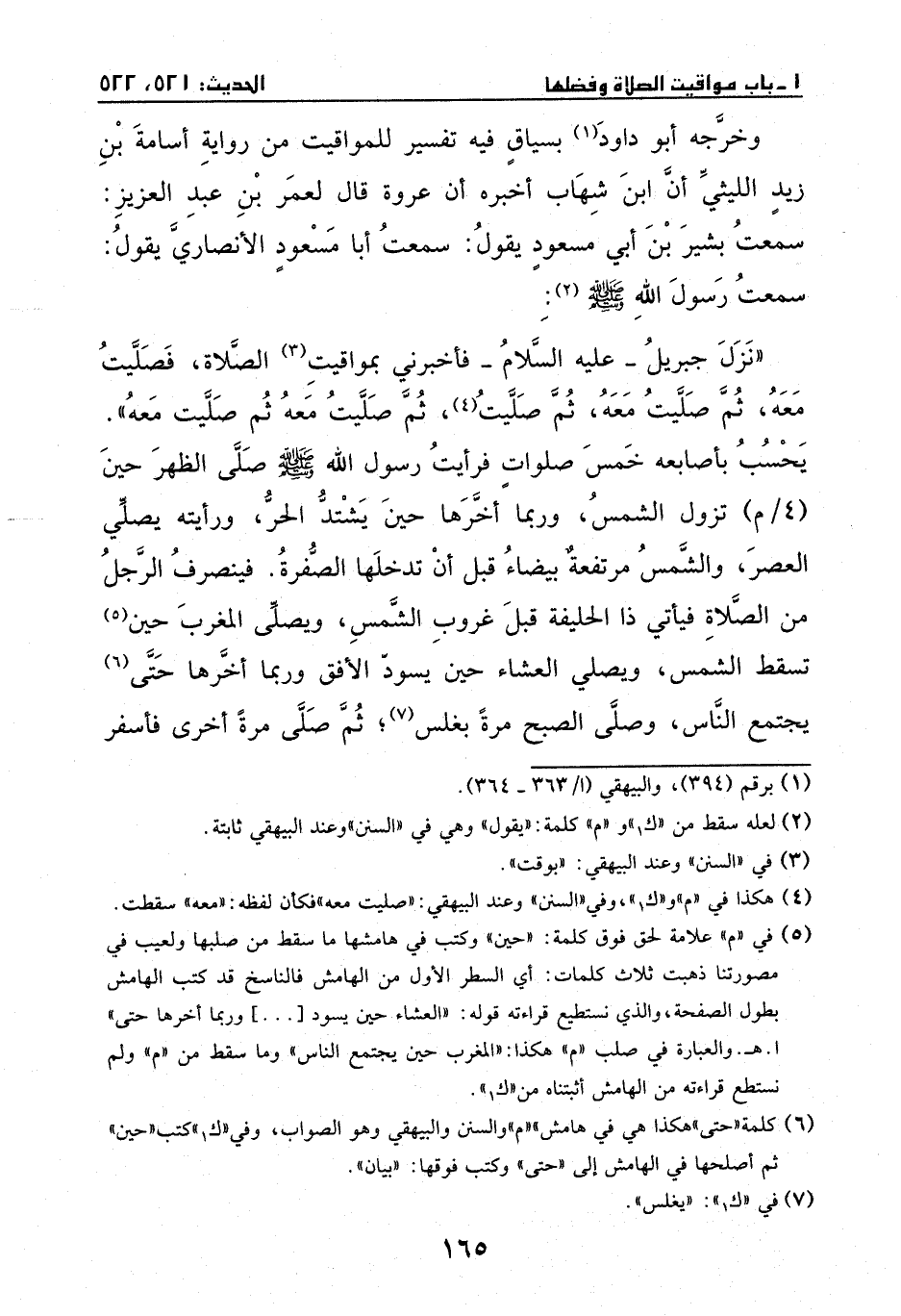 وخرجه أبو داود بسياق فيه تفسير المواقيت من رواية أسامة بن زيد الليثي، ان ابن شهاب أخبره، أن عروة قال لعمر بن عبد العزيز: سمعت بشير بن أبي مسعود يقول: سمعت أبا مسعود الأنصاري يقول: سمعت رسول الله - صَلَّى اللهُ عَلَيْهِ وَسَلَّمَ - {يقول} : ((نزل جبريل عليه السلام فاخبرني بمواقيت الصلاة، فصليت معه، ثم صليت معه، ثم صليت {معه} ، ثم صليت معه، ثم صليت معه)) ، يحسب بأصابعه خمس صلوات، فرأيت رسول الله - صَلَّى اللهُ عَلَيْهِ وَسَلَّمَ - صلى الظهر حين تزول الشمس، وربما أخرها حين يشتد الحر، ورأيته يصلى العصر والشمس مرتفعة بيضاء قبل ان تدخلها الصفرة، فينصرف الرجل من الصلاة فيأتي ذا الحليفة قبل غروب الشمس، ويصلى المغرب حين تسقط الشمس، ويصلى العشاء حين يسود الأفق، وربما أخرها حتى يجتمع الناس، وصلى الصبح مرة بغلس ثم صلى مرة اخرى فأسفر