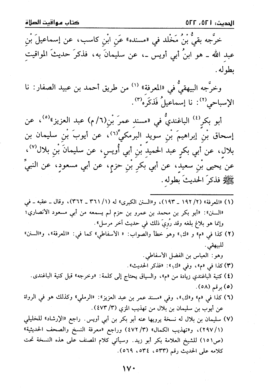 خرجه بقي بن مخلد في "مسنده" عن ابن كاسب، عن إسماعيل بن عبد الله - هو: ابن أبي أويس -، عن سليمان، به - فذكر حديث المواقيت بطوله.