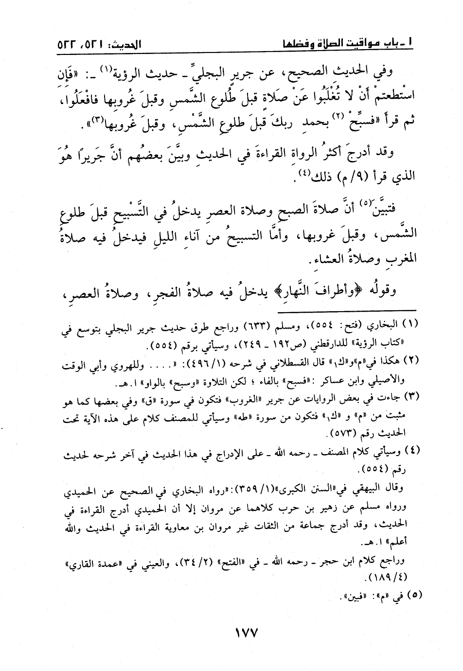وقد ادرج اكثر الرواة القراءة في الحديث، وبين بعضهم: أن جريرا هو الذي قرأ ذلك، فبين أن صلاة الصبح وصلاة العصر يدخل في التسبيح قبل طلوع الشمس وقبل غروبها، وأماالتسبيح من آناء الليل فيدخل فيه صلاة المغرب وصلاة العشاء. وقوله: