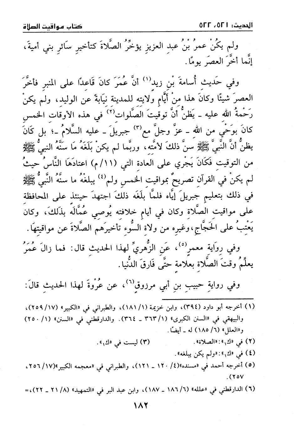 وكان هذا في أيام ولايته للمدينة نيابة عن الوليد، ولم يكن - رحمة الله عليه - يظن أن توقيت الصلوات في هذه الأوقات الخمس كان بوحي من الله عز وجل مع جبريل عليه السلام، بل كان يظن ان النبي - صَلَّى اللهُ عَلَيْهِ وَسَلَّمَ - سن ذلك لأمته، وربما لم يكن بلغَهُ ما سنه النبي - صَلَّى اللهُ عَلَيْهِ وَسَلَّمَ - من التوقيت، فكان يجري على العادة التي اعتادها الناس، حيث لم يكن في القران تصريح بمواقيت الخمس، ولم يبلغه ما سنه النبي - صَلَّى اللهُ عَلَيْهِ وَسَلَّمَ - في ذلك بتعليم جبريل إياه، فلما بلغه ذلك اجتهد حينئذ على المحافظة على مواقيت الصلاة، وكان في أيام خلافته يوصي عماله بذلك، وكان يعتب على الحجاج وغيره من ولاة السوء تأخيرهم الصلاة عن مواقيتها.