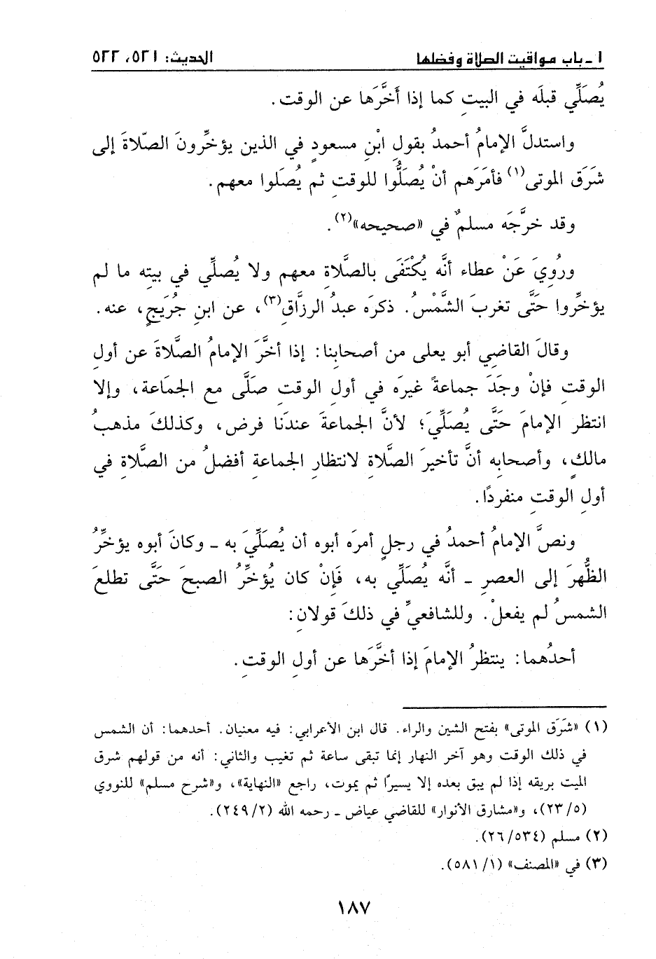 واستدل الإمام أحمد بقول ابن مسعود في الذين يؤخرون الصلاة إلى شرق الموتى، فأمرهم أن يصلوا للوقت، ثم يصلوا معهم.