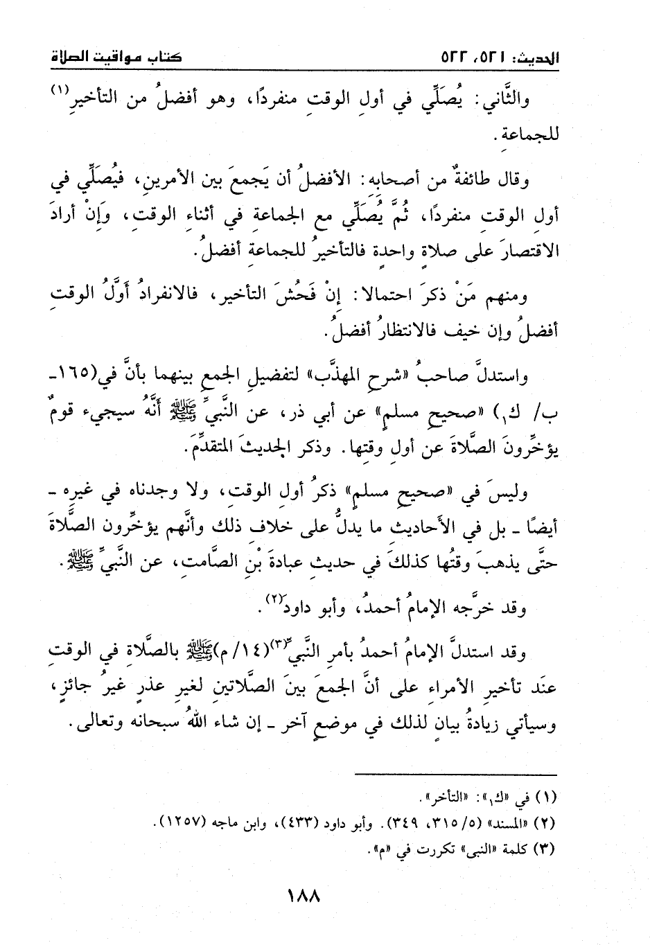 وقد استدل الإمام أحمد بأمر النبي - صَلَّى اللهُ عَلَيْهِ وَسَلَّمَ - بالصلاة في الوقت عند تأخير الإمراء على أن الجمع بين الصلاتين لغير عذر غير جائز.