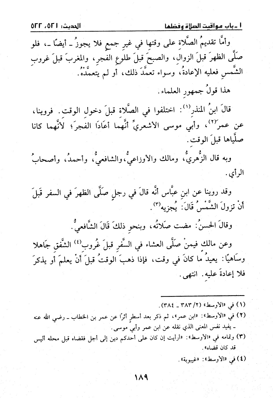 قال ابن المنذر: اختلفوا في الصلاة قبل دخول الوقت، فروينا عن عمر وأبي موسى الاشعري، أنهما أعادا الفجر لأنهما كان صلياها قبل الوقت، وبه قال الزهري ومالك والأوزعي والشافعي وأحمد وأصحاب الرأي، وقد روينا عن ابن عباس، أنه قال في رجل صلى الظهر في السفر قبل أن تزول الشمس، قال: يجزئه. وقال الحسن: مضت صلاته. وبنحو ذلك قال الشافعي.