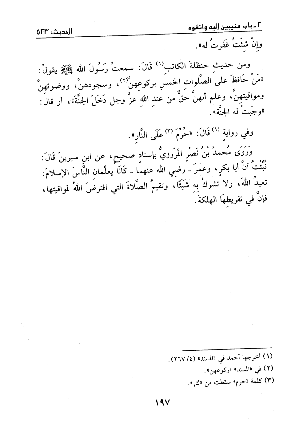 ومن حديث حنظلة الكاتب، قال: سمعت رسول الله - صَلَّى اللهُ عَلَيْهِ وَسَلَّمَ - يقول: ((من حافظ على الصلوات الخمس بركوعهن وسجودهن ووضوئهن ومواقيتهن، وعلم أنهن حق من عند الله عز وجل دخل الجنة)) - او قال: ((وجبت له الجنة)) -، وفي رواية قال: ((حرم على النار)) .
