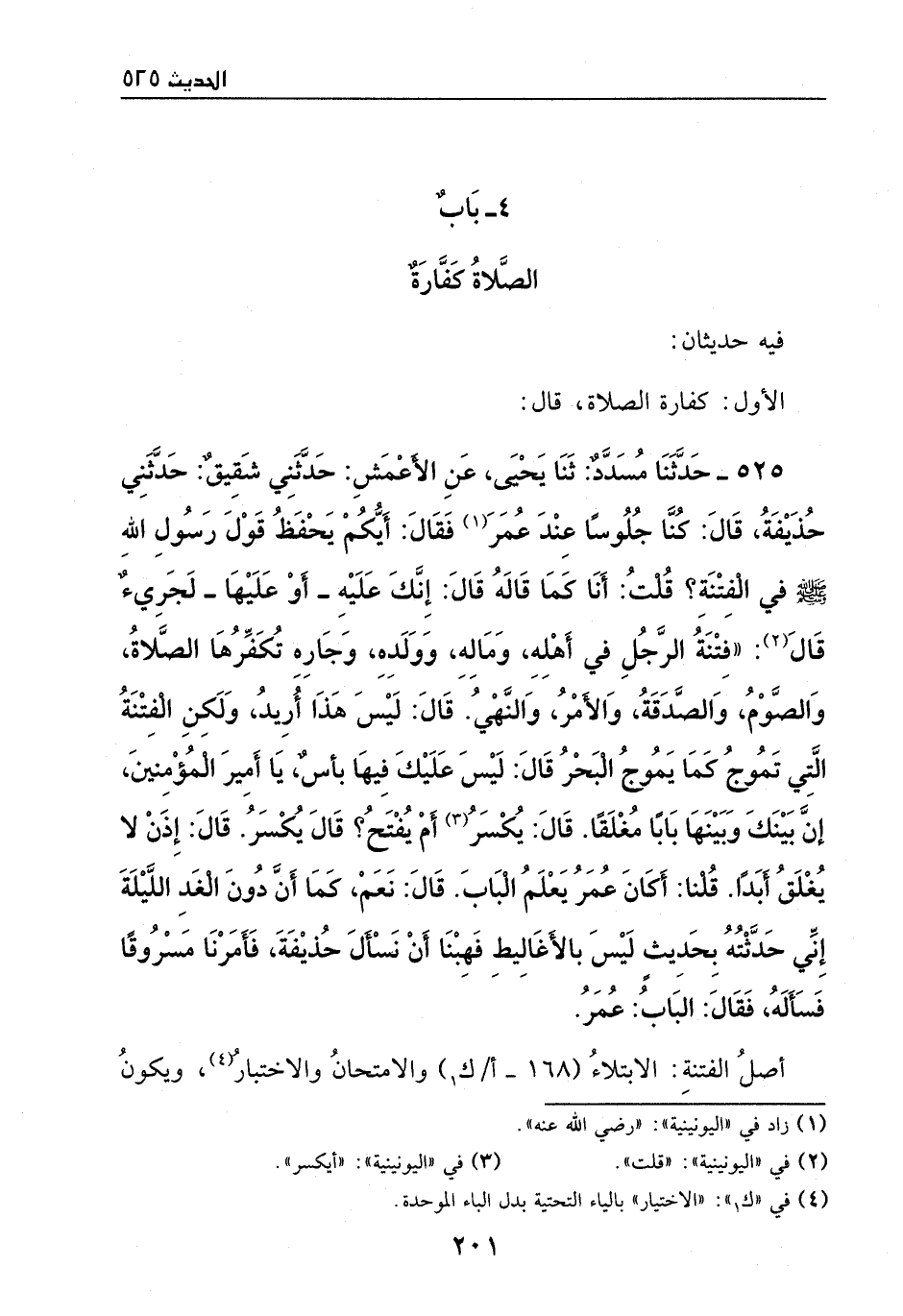 525 - حدثنا مسدد: ثنا يحيى، عن الأعمش: حدثني شقيق: حدثني حذيفة، قال: كنا جلوساً عند عمر، فقال: أيكم يحفظ قول رسول الله - صَلَّى اللهُ عَلَيْهِ وَسَلَّمَ - في الفتنة؟ قلت: أنا كما قاله. قال: إنك عليه - أو عليها - لجريء. قلت: فتنة الرجل في أهله وماله ولده وجاره، تكفرها الصلاة والصوم والصدقة والأمر والنهي. قال: ليس هذا أريد، ولكن الفتنة التي تموج كما يموج البحر. قال: ليس عليك منها بأس يا أمير المؤمنين، إن بينك وبينها باباً مغلقاً. قال: يكسر أم يفتح؟ قال: يكسر. قال: إذن لا يغلق أبداً.