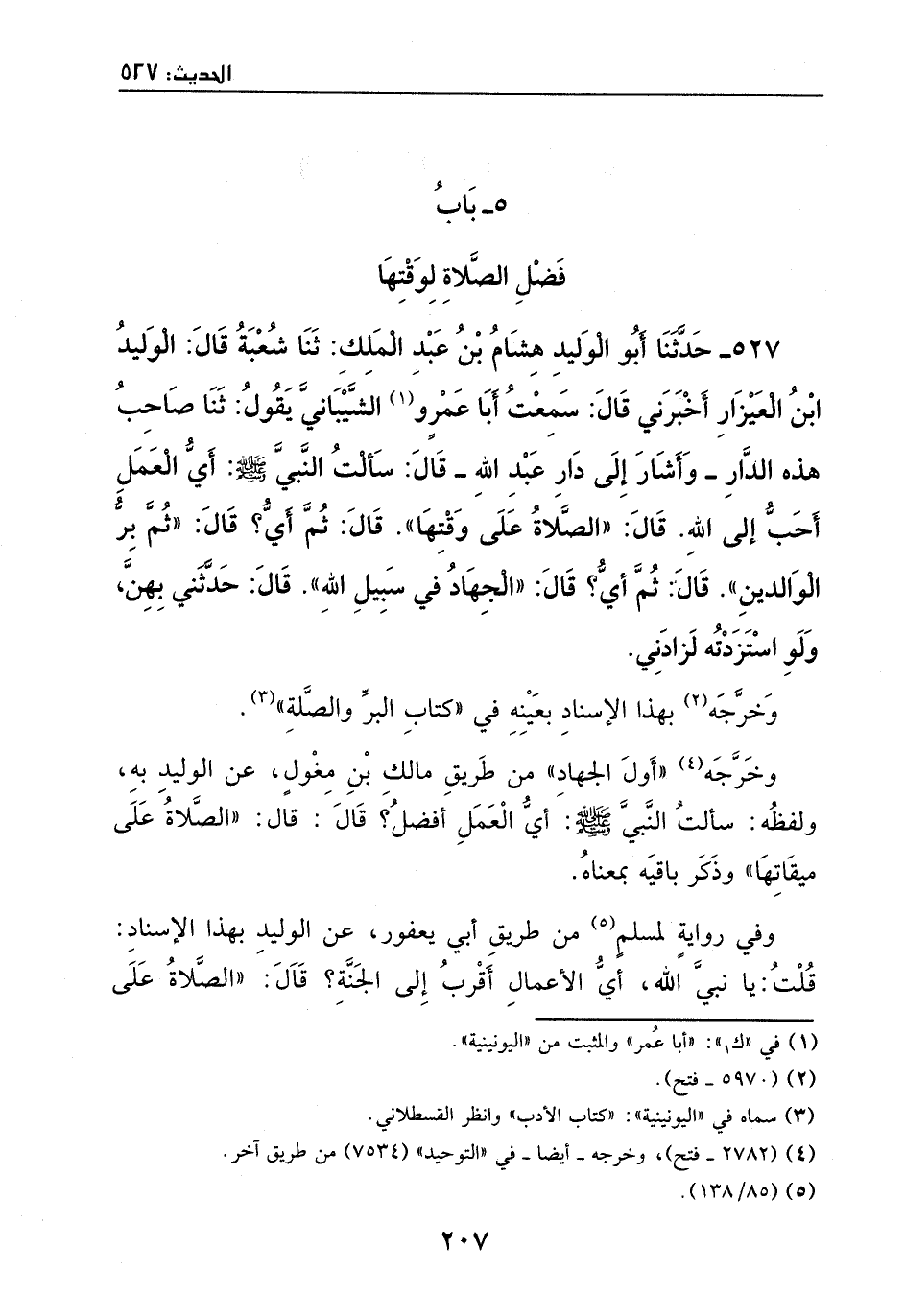 527 - حدثنا أبو الوليد هشام بن عبد الملك: ثنا شعبة، قال: الوليد بن العيزار أخبرني، قال: سمعت أبا عمرو الشيباني يقول: ثنا صاحب هذه الدار - وأشار إلى دار عبد الله -، قال: سألت النبي - صَلَّى اللهُ عَلَيْهِ وَسَلَّمَ -: أي العمل أحب إلى الله؟ قال: ((الصلاة على وقتها)) . قال: ثم أي؟ قال: ((ثم بر الوالدين)) . قال: ثم أي؟ قال: ((الجهاد في سبيل الله)) . قال: حدثني بهن، ولو استزدته لزداني.