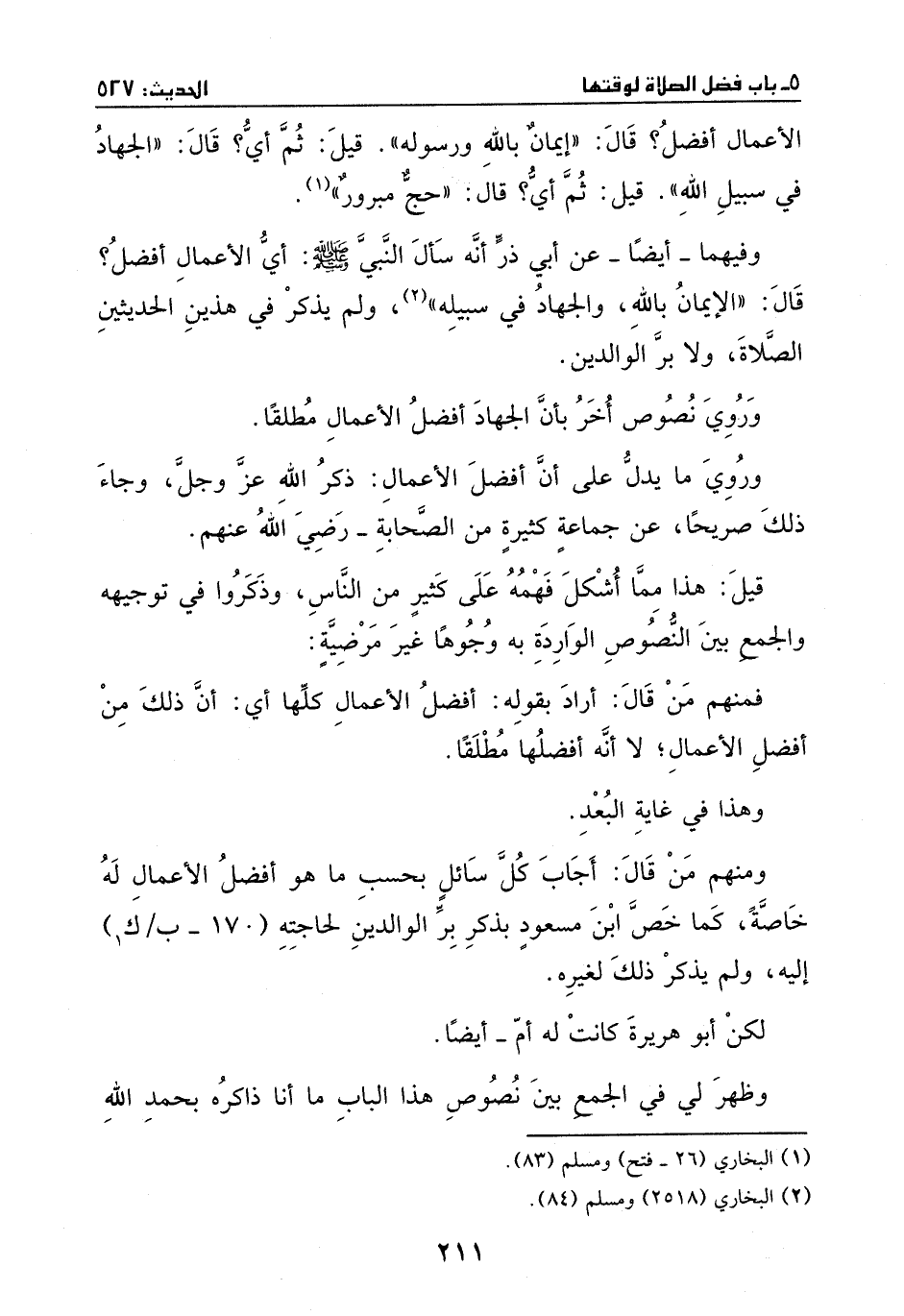 ولم يذكر في هذين الحديثين الصلاة ولا بر الوالدين، وروي نصوص أُخر بأن الجهاد أفضل الأعمال مطلقاً، وروي ما يدل على أن أفضل الأعمال ذكر الله عز وجل، وجاء ذلك صريحاً عن جماعة كثيرة من الصحابة – رضي الله عنهم -.