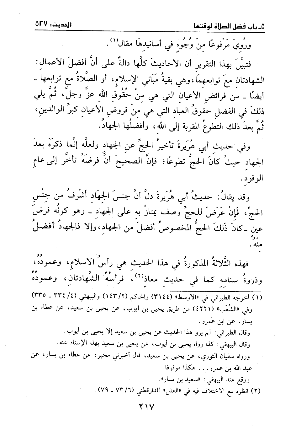 فتبين بهذا التقرير أن الأحاديث كلها دالة على أن أفضل الأعمال الشهادتان مع توابعهما، وهي بقية مباني الإسلام، أو الصلاة مع توابعها - أيضا - من فرائض الأعيان التي هي من حقوق الله عز وجل، ثم يلي ذلك في الفضل حقوق العباد التي هي من فروض الأعيان، كبر الوالدين، ثم بعد ذلك [أعمال] التطوع المقربة إلى الله، وأفضلها الجهاد.