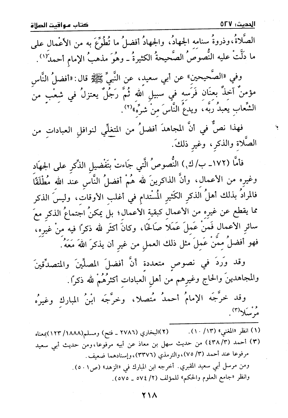 فهذا نص في أن المجاهد أفضل من المتخلي لنوافل العبادات من الصلاة والذكر وغير ذلك، فأماالنصوص التي جاءت بتفضيل الذكر على الجهاد وغيره من الأعمال، وأن الذاكرين لله أفضل الناس عند الله مطلقاً فالمراد بذلك أهل الذكر الكثير المستدام في أغلب الأوقات.