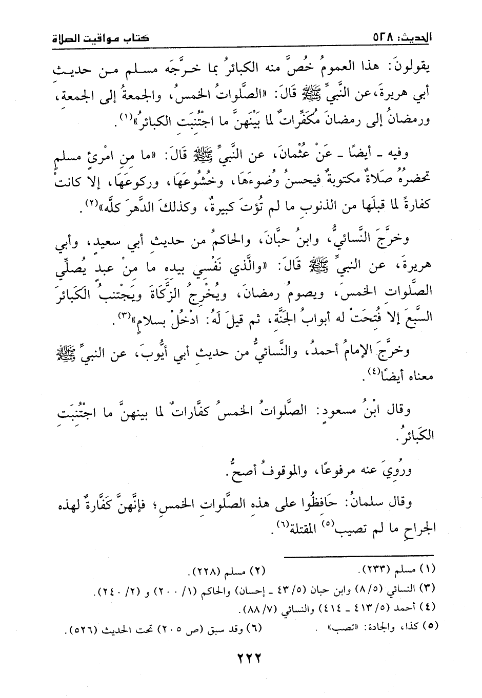 وقال سلمان: حافظوا على هذه الصلوات الخمس؛ فإنهن كفارة لهذه الجراح، ما لم تصب المقتلة.