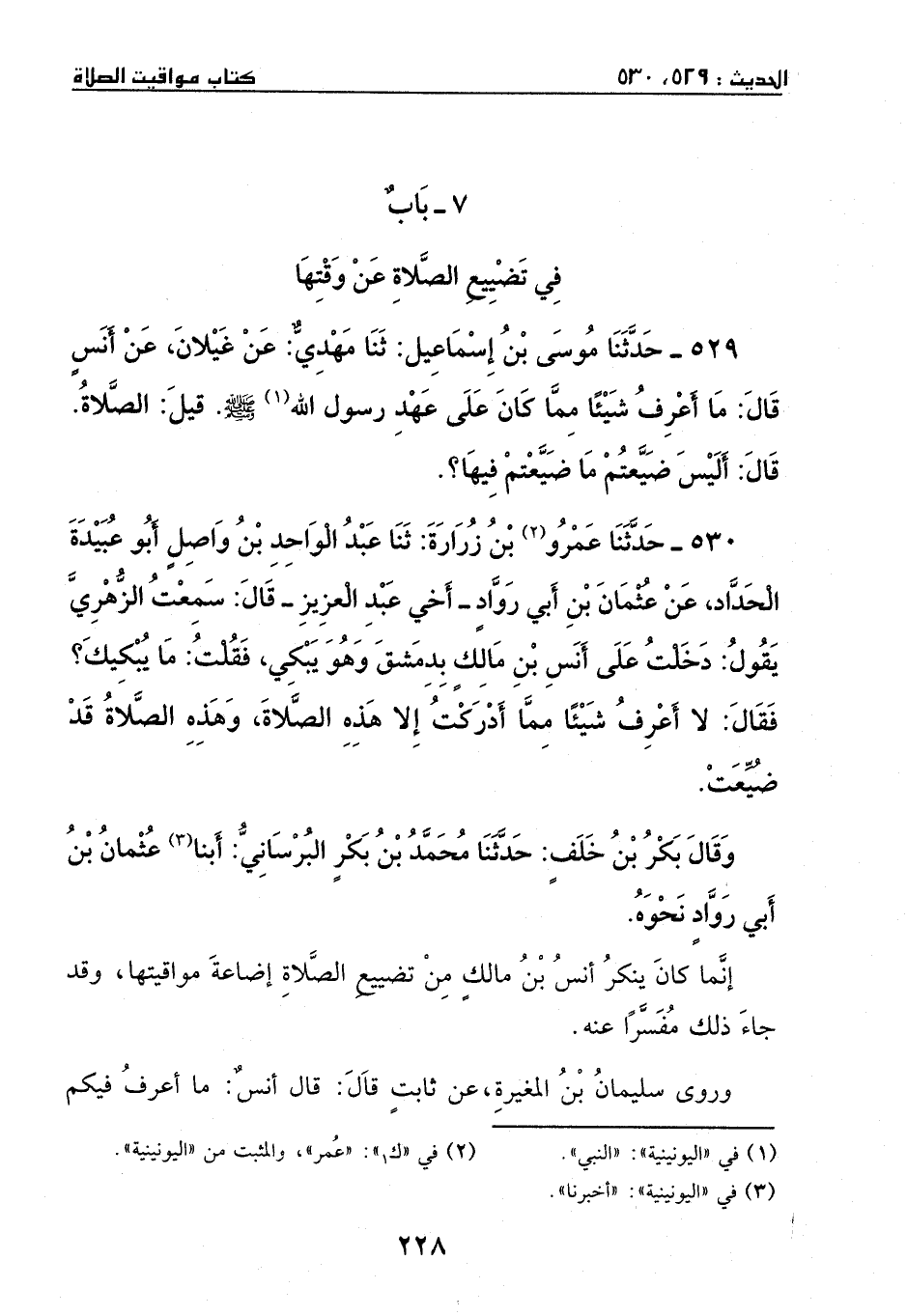 529 - حدثنا موسى بن إسماعيل: ثنا مهدي، عن غيلان، عن أنس، قال: ما أعرف شيئاً مما كان على عهد رسول الله - صَلَّى اللهُ عَلَيْهِ وَسَلَّمَ - قيل: الصلاة؟ قال: أليس ضيعتم ما ضيعتم فيها؟
