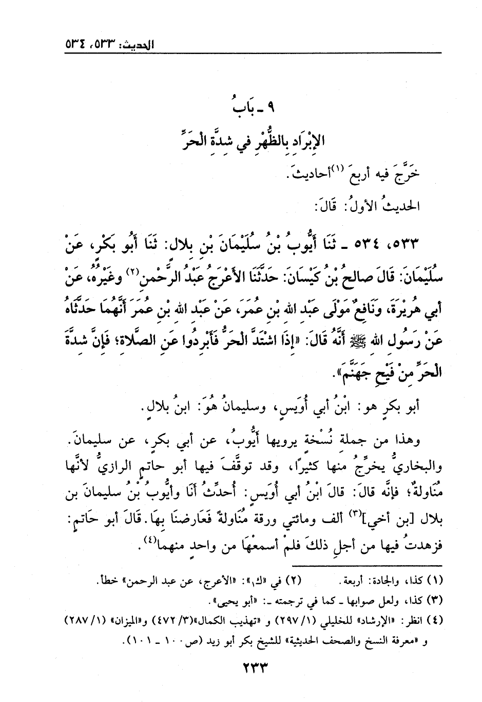 533، 534 - ثنا أيوب بن سليمان بن بلال: ثنا أبو بكر، عن سليمان، قال صالح بن كيسان: حدثنا الأعرج عبد الرحمان وغيره، عن أبي هريرة - ونافع مولى عبد الله بن عمر، عن عبد الله بن عمر -، أنهما حدثاه عن رسول الله - صَلَّى اللهُ عَلَيْهِ وَسَلَّمَ -، أنه قال: ((إذا اشتد الحر فأبردوا عن الصلاة؛ فإن شدة الحر من فيح جهنم)) .