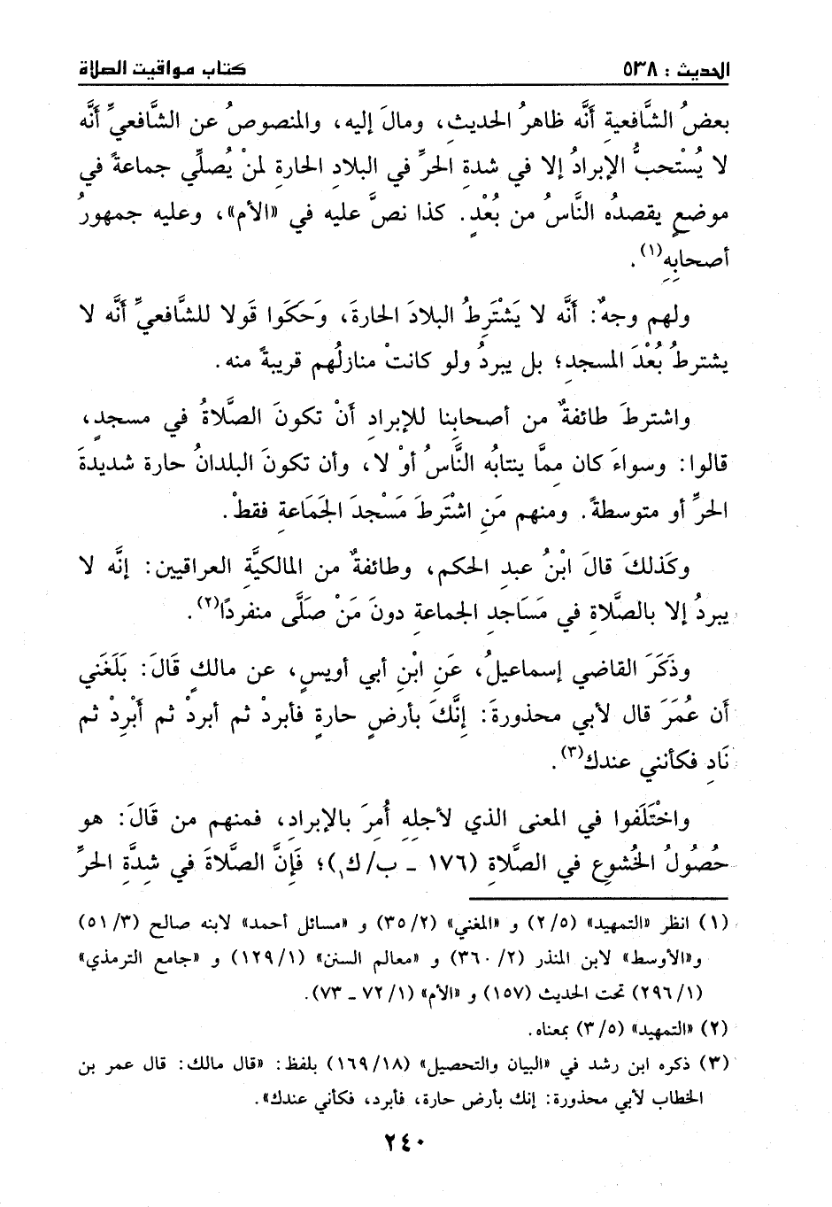 وكذلك قال ابن عبد الحكم وطائفة من المالكية العراقيين: أنه لا يبرد إلا بالصلاة في مساجد الجماعة دون من صلى منفرداً.
