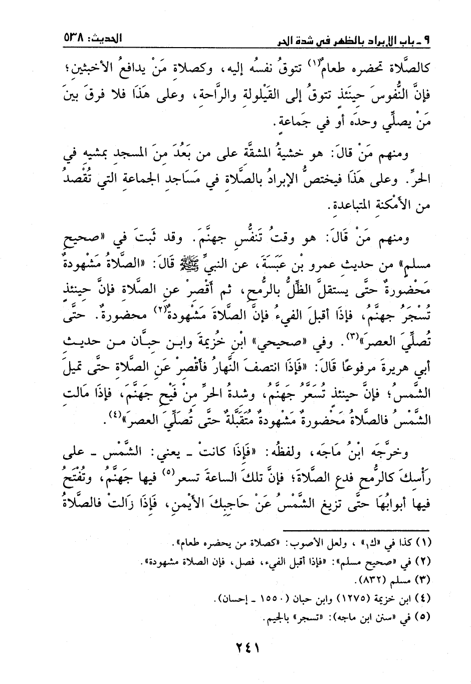 وخرجه ابن ماجه، ولفظه: " فإذا كانت - يعني: الشمس – على رأسك كالرمح فدع الصلاة؛ فإن تلك الساعة تسعر فيها جهنم، وتفتح فيها أبوابها، حتى تزيغ الشمس عن حاجبك الأيمن، فإذا زالت فالصلاة